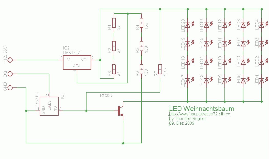 Koomisch...dem lm317 hast du gleich 6 Widerstände spendiert statt einfach 2 und den armen LEDs nach ausdrücklichsten Ratschlägen nun doch wieder keine. Warum hast du oben nicht geschrieben dass du gar keinen Rat haben willst? Und von der Busfähigkeit mal abgesehen brauchte der Weihnachtsbaum vor dem Umbau nur 2 Anschlüsse und jetzt gleich 3. Da ich keiner bin der sich gleich 15 Weihnachtsbäumchen gleichzeitig aufstellt verschliesst sich mir da der Nutzen. Immerhin kannst du jetzt 1-Wire-Hardware ansteuern, herzlichen Glückwunsch und frohe Weihnachten!