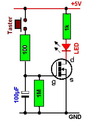 Der Feldeffekttransistor zieht an seinem Gate praktisch keinerlei Strom. Was macht denn der Rest deines charmageschüttelten Körpers, während er die Strippe hält? Eventuell fließt da schon genug Strom, um den 1MOhm Widerstand lange zu kompensieren. 100uF und 1M ergeben ne ziemlich große Zeitkonstante.