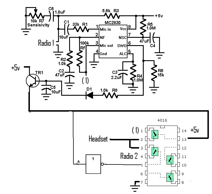 Guten Abend Ich möchte zwei Funkgeräte mit einem Headset verwenden. Lautsprecher Die Herausforderung besteht meines erachten beim mischen der Audiosignale für den Lautsprecher. Die Schaltung muss automatisch das empfangende Funkgerät durch stellen und falls beide ein Signal empfangen nur Funkgerät 1. Falls es möglich ist, muss dem Benutzer durch ein akustisches Signal mitgeteilt wenn er das Funkgerät 2 hört. Eine Möglichkeit um diese Schaltung zu realisieren sehe ich in zwei VOX-Schaltungen(http://www.qslnet.de/member/dc3rj/VOX/vox.htm) in Kombination mit einem 4016 (http://www.doctronics.co.uk/4016.htm). Diese Schaltung würde nicht ganz meinen Anforderung entsprechen ist aber durchaus brauchbar. Meine Frage an euch gibt es einfachere/ bessere/ andere Lösungen? Mikrofon und PTT Da die Funktion auf beiden Funkgeräte gleichzeitig zu senden nicht benötigt wird würde ich die Umschaltung einfach durch Umschalter lösen, also einen Taster zum senden und einen Switch für die Umschaltung von Funkgerät 1 zu Funkgerät 2. Danke und Gruss moskito
