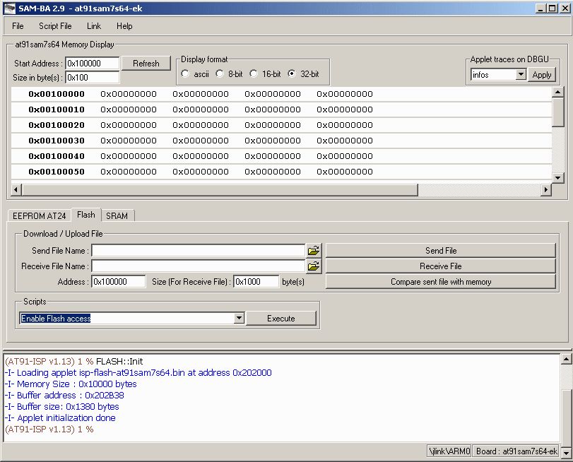 Beim Programmieren mit SAM-BA (siehe Bild) ist ein Problem aufgetaucht. Bei einigen AT91SAMS64B zeigt SAM-BA den FLASH-Speicher immer als 00000000 an, obwohl der Chip mit gelöscht wurde (ERASE gegen VCC). Kennt jemand das Problem und kann mir einen Rat geben? Was macht eigentlich das Applet 'Enable Flash Access' (siehe Bild)? Muß ich außer EXECURE drücken noch etwas tun?
