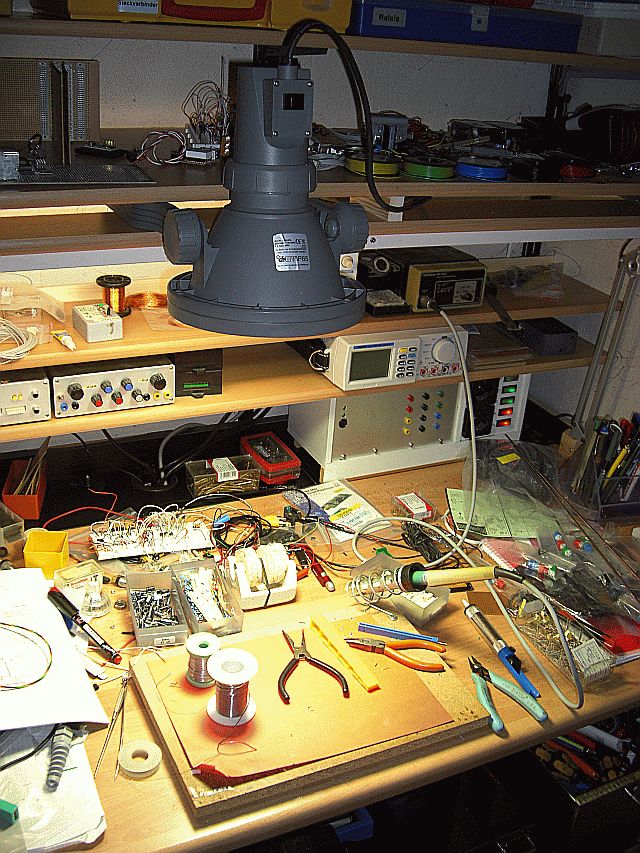 Wenn man nur wüsste was ***(GAST) am Schreibtisch machen will, Brifmarken sotieren, Bilder ausmalen oder löten ... hier mein Lötplatz 60W Leuchtstoff <=> 150W Glühlampe und wie gesagt der Platz bleibt kalt, keine lästigen Schatten, blendfrei ... hatte selber lange nach einer Lösung gesucht und endlich gefunden :-)