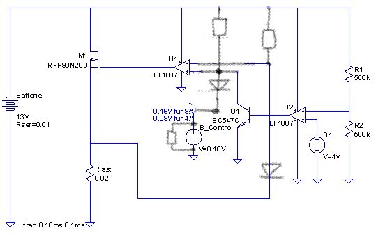Hallo also mein problem ist folgendes: ich habe eine batterie die ich mit einer spannungsgesteuerten stromquelle belaste. die batterie hat normaler weise 12V. bei belastung fällt eine batterie zum bsp auf 6Volt. Meine Aufgabe ist es jetzt die spannungsgesteuerte stromquelle so zu steuern das die batterie nie unter 8V fallen kann bei Belastung. hat jemand einen schaltungsvorschlag lg michi