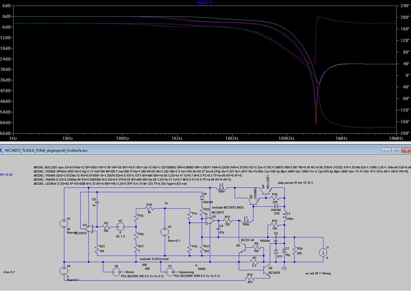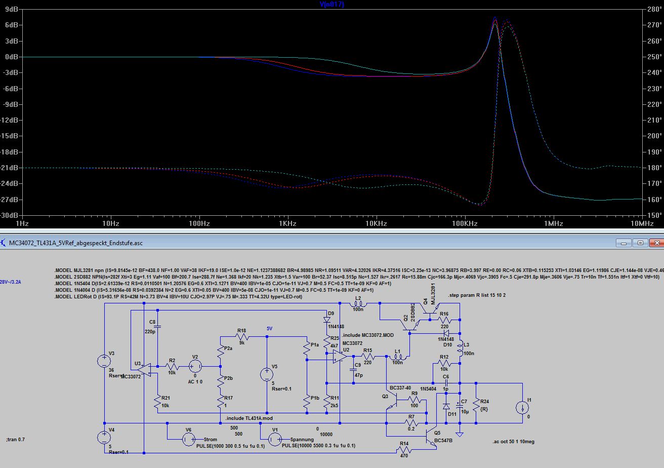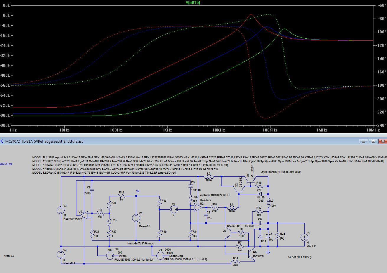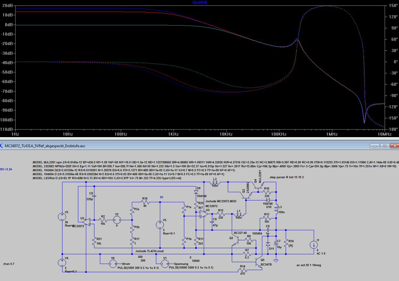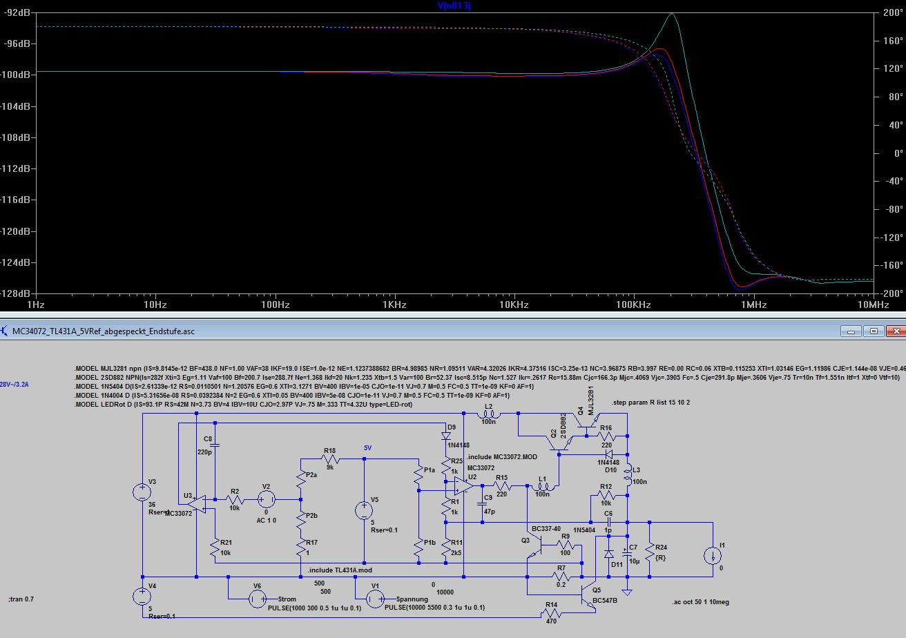 Bleibt wie dr Stromregler auf die Ausgangselkoimpedanz reagiert 10uF mit 1R gegenüber 10u mit 0.1R. Völlig unterschiedliches Verhalten, 0.1 Ohm sind wie beim Spannungsregler zu wenig, was kein Wunder ist, denn dem Stromregler ist ja der Spannungsregler nachgeschaltet. Ich finde die Grundauslegung mit 220p und 4k7 angemessen, aber wenn jemand aus den Diagrammen anders liest, kann er das gern kund tun. Anbei noch die ASC.
