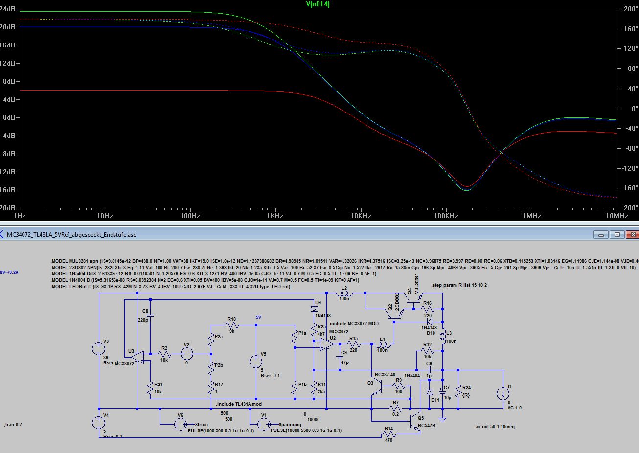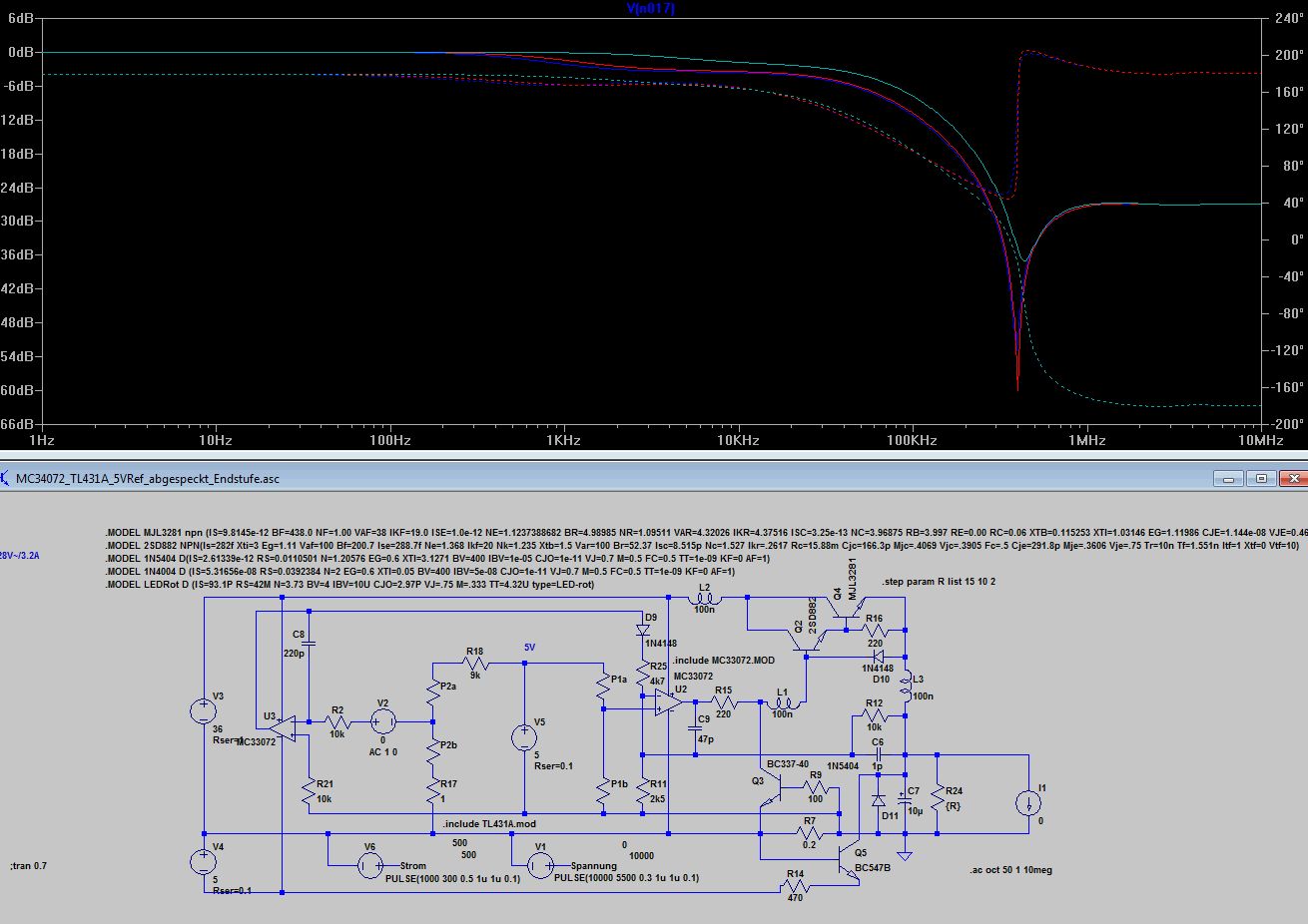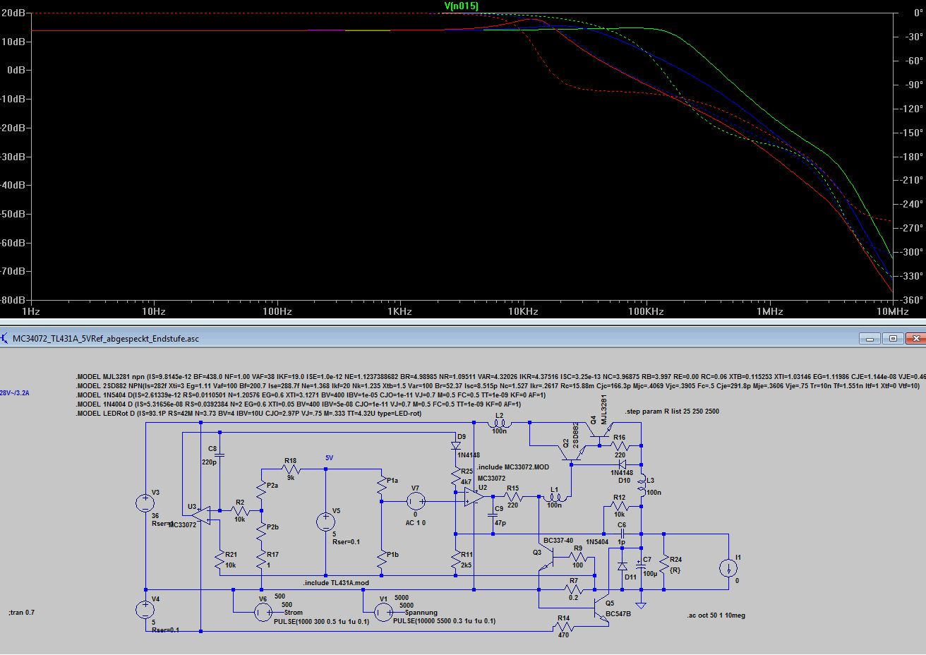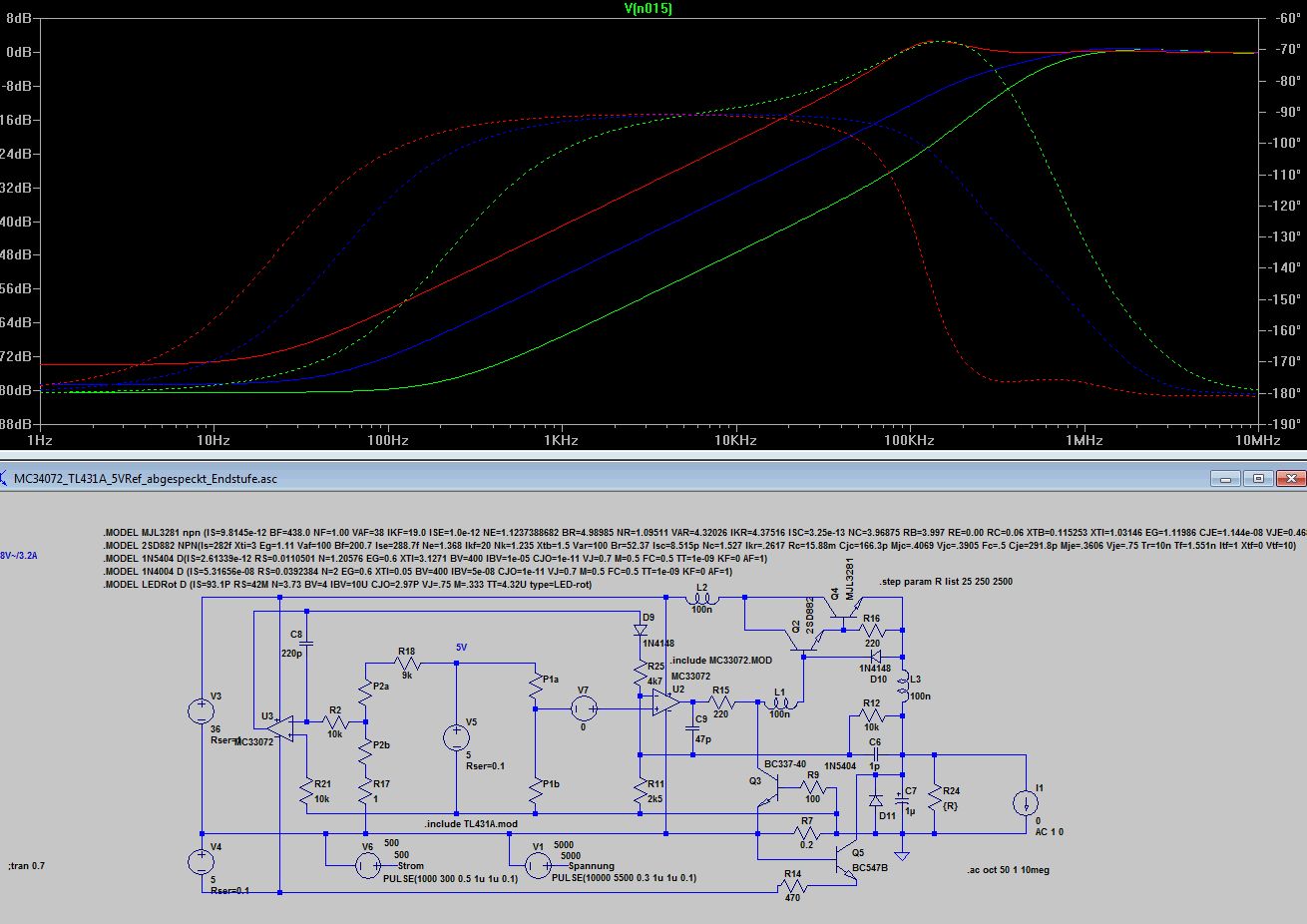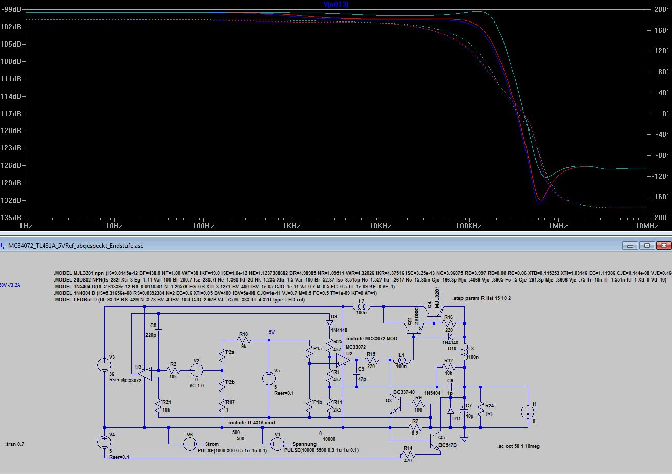 Bleibt wie dr Stromregler auf die Ausgangselkoimpedanz reagiert 10uF mit 1R gegenüber 10u mit 0.1R. Völlig unterschiedliches Verhalten, 0.1 Ohm sind wie beim Spannungsregler zu wenig, was kein Wunder ist, denn dem Stromregler ist ja der Spannungsregler nachgeschaltet. Ich finde die Grundauslegung mit 220p und 4k7 angemessen, aber wenn jemand aus den Diagrammen anders liest, kann er das gern kund tun. Anbei noch die ASC.