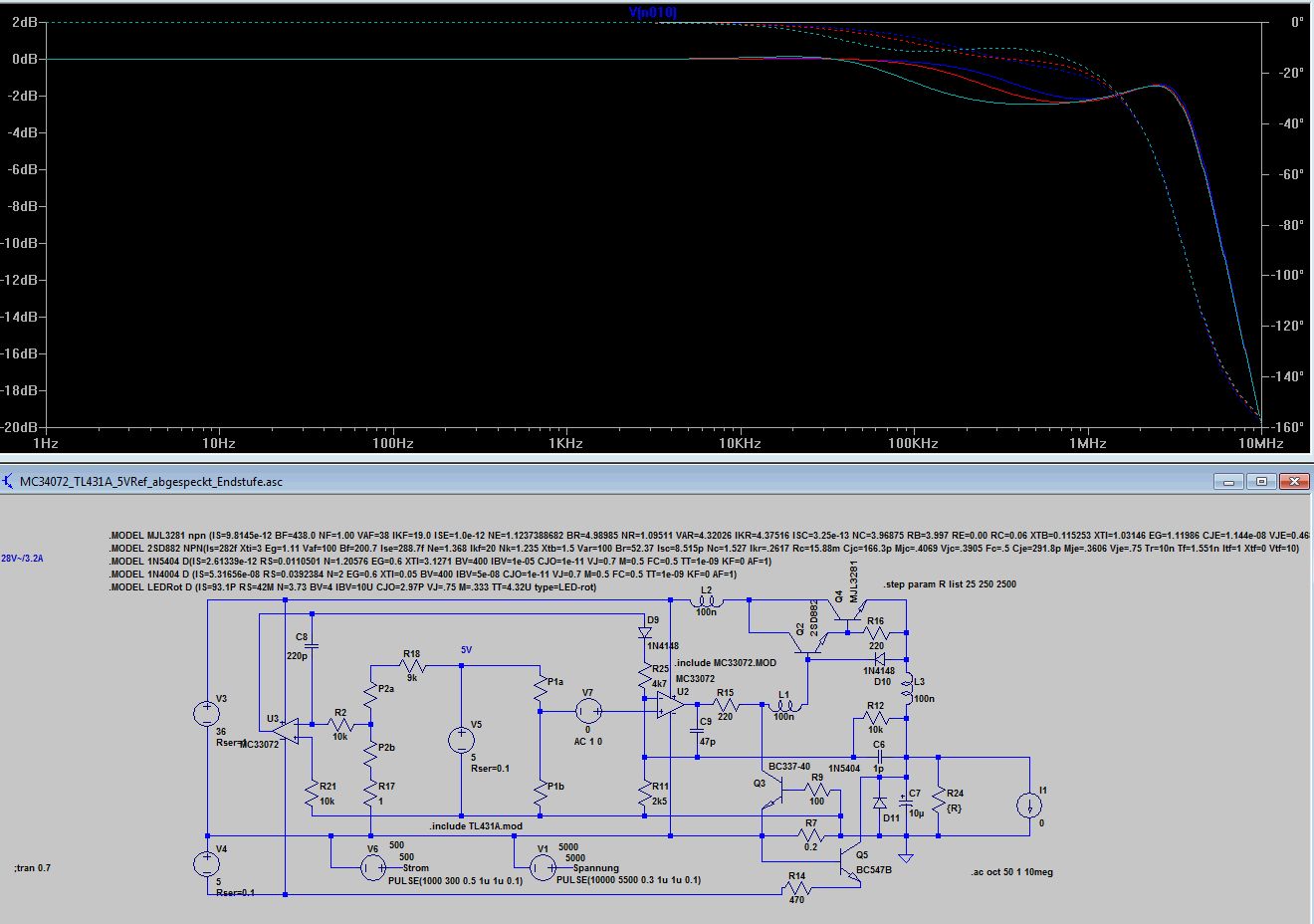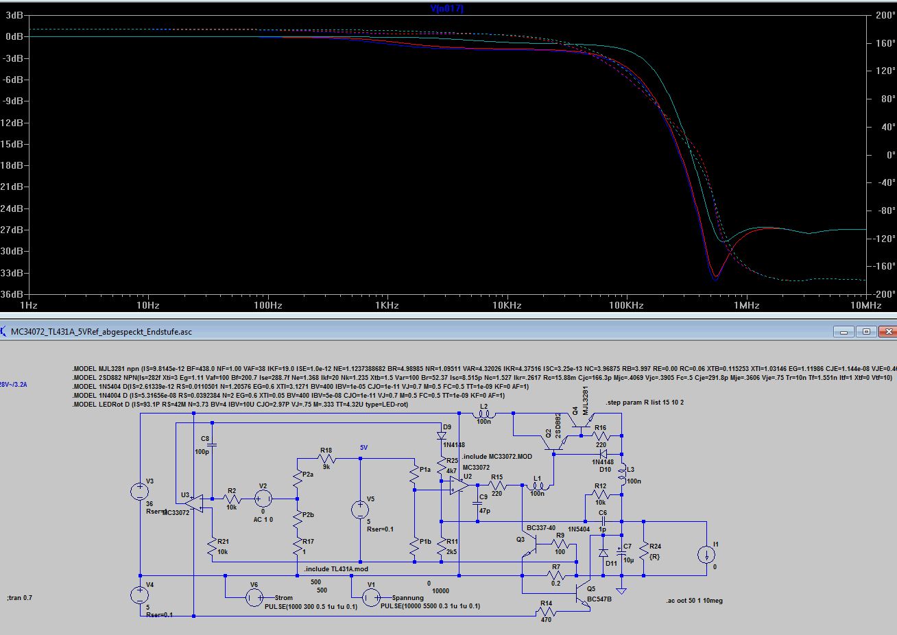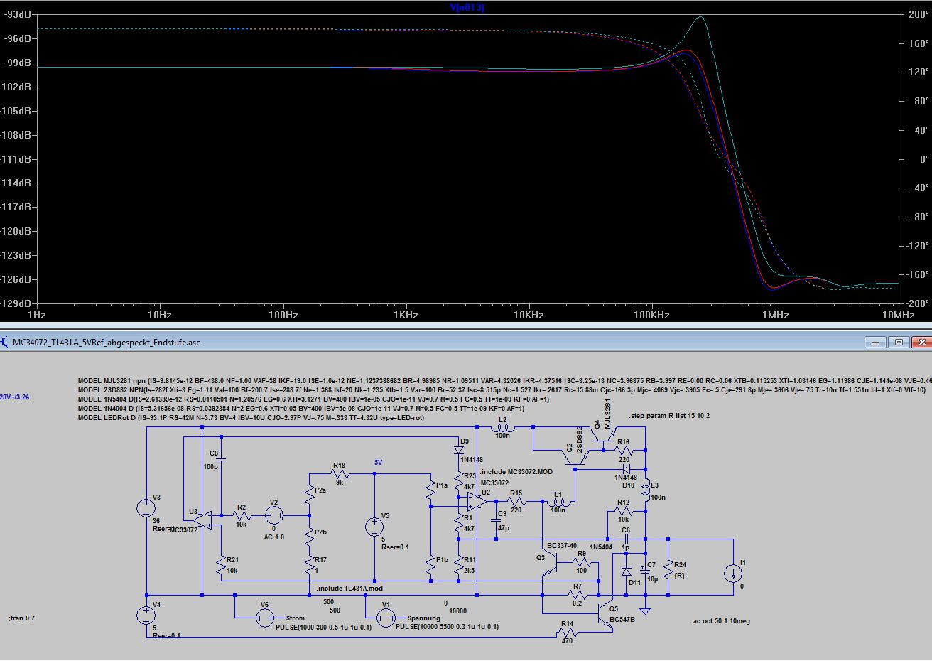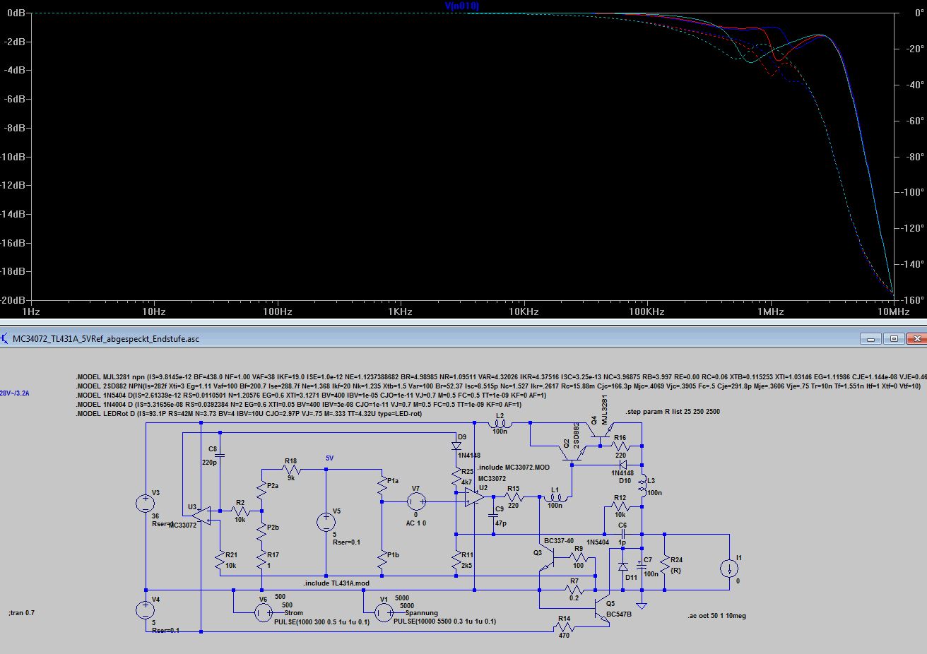 Bleibt wie dr Stromregler auf die Ausgangselkoimpedanz reagiert 10uF mit 1R gegenüber 10u mit 0.1R. Völlig unterschiedliches Verhalten, 0.1 Ohm sind wie beim Spannungsregler zu wenig, was kein Wunder ist, denn dem Stromregler ist ja der Spannungsregler nachgeschaltet. Ich finde die Grundauslegung mit 220p und 4k7 angemessen, aber wenn jemand aus den Diagrammen anders liest, kann er das gern kund tun. Anbei noch die ASC.