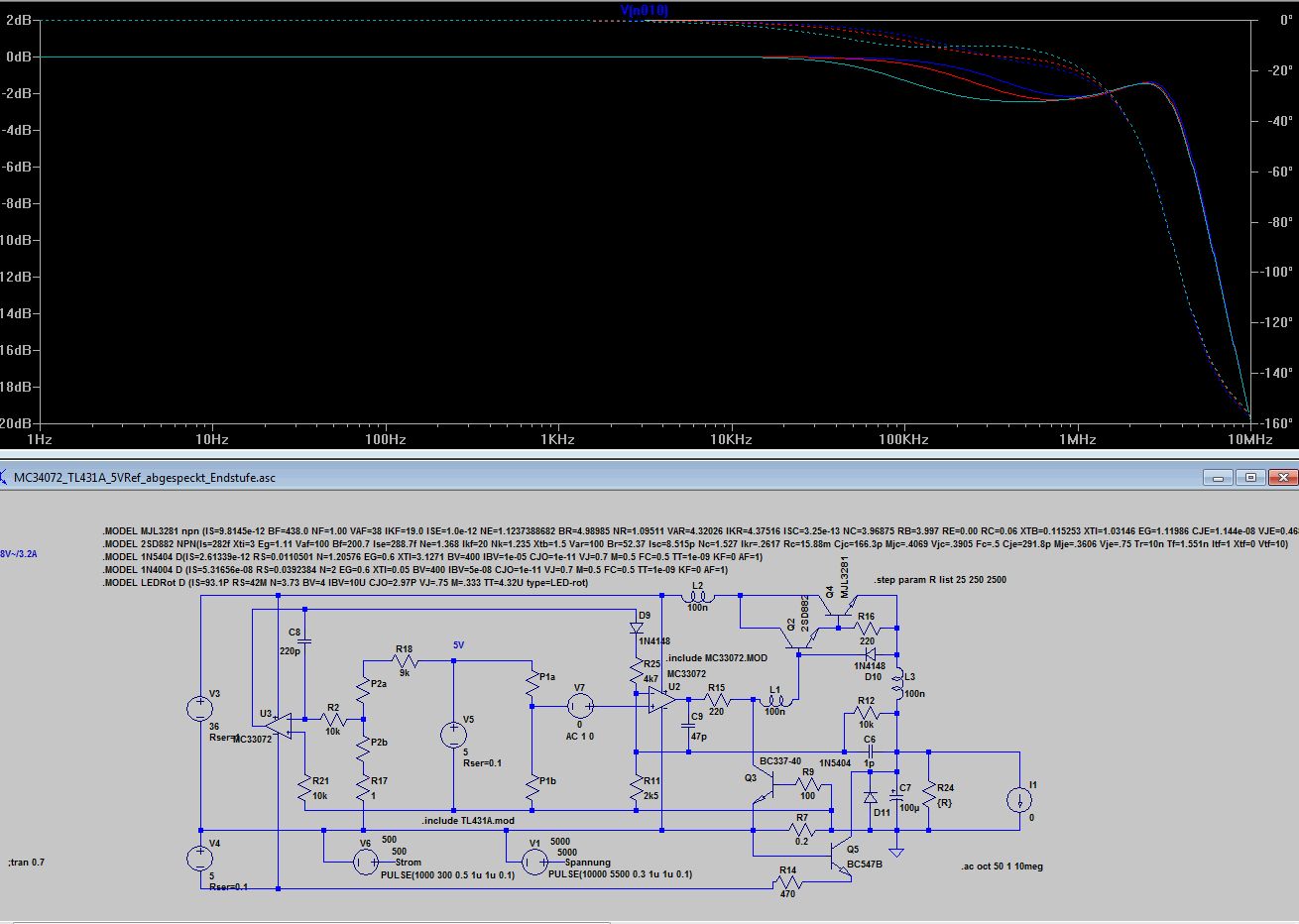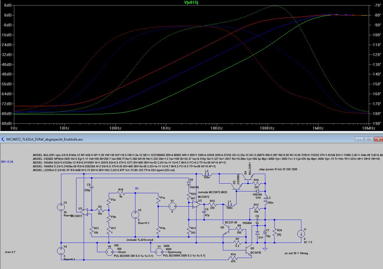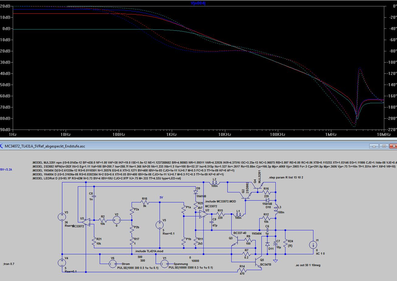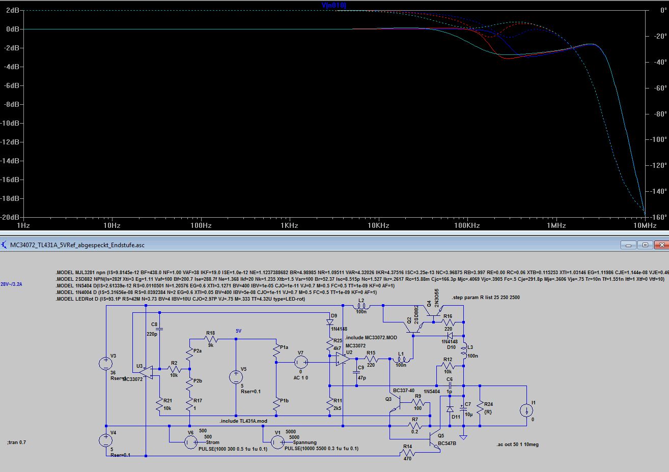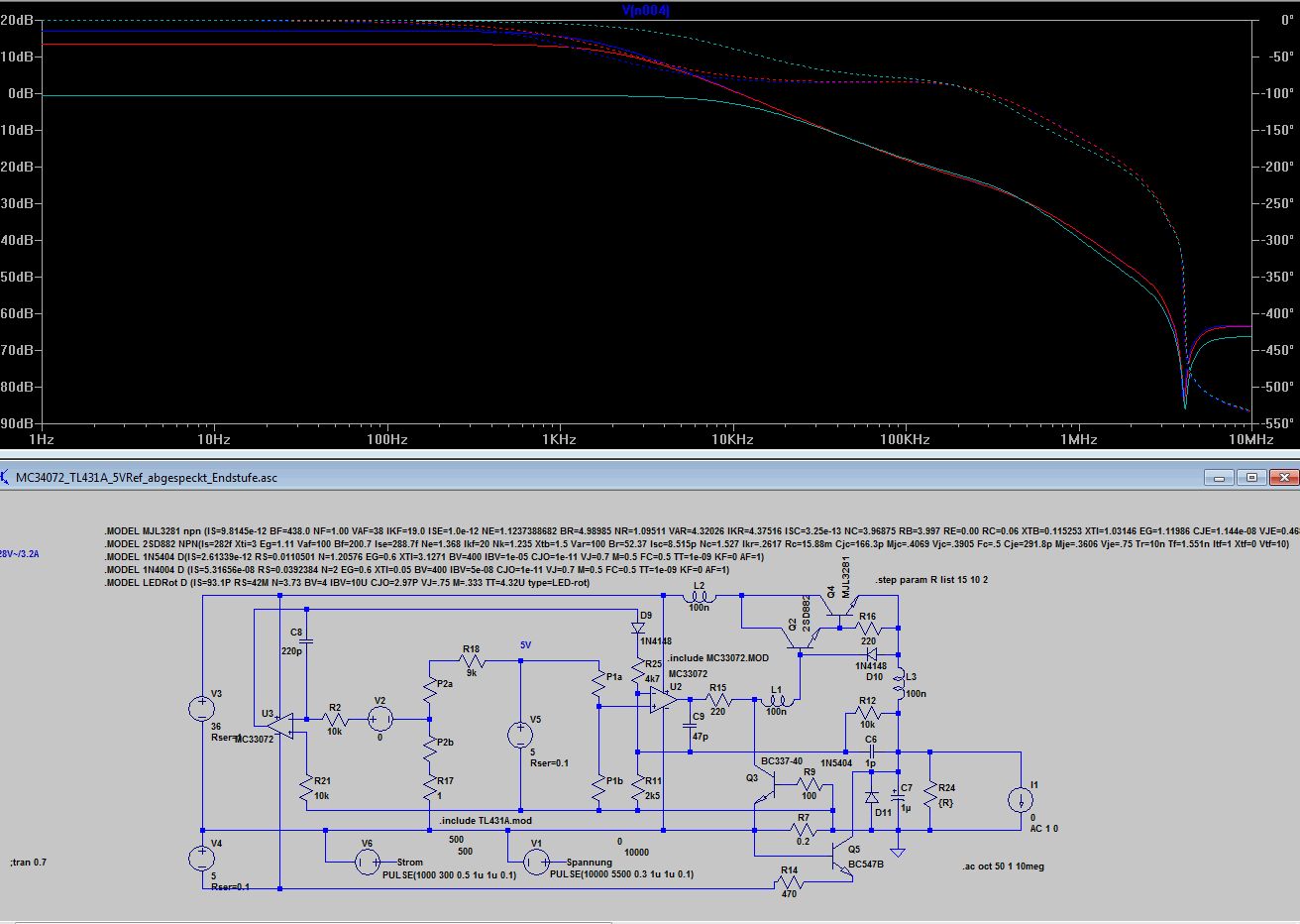 Bleibt wie dr Stromregler auf die Ausgangselkoimpedanz reagiert 10uF mit 1R gegenüber 10u mit 0.1R. Völlig unterschiedliches Verhalten, 0.1 Ohm sind wie beim Spannungsregler zu wenig, was kein Wunder ist, denn dem Stromregler ist ja der Spannungsregler nachgeschaltet. Ich finde die Grundauslegung mit 220p und 4k7 angemessen, aber wenn jemand aus den Diagrammen anders liest, kann er das gern kund tun. Anbei noch die ASC.