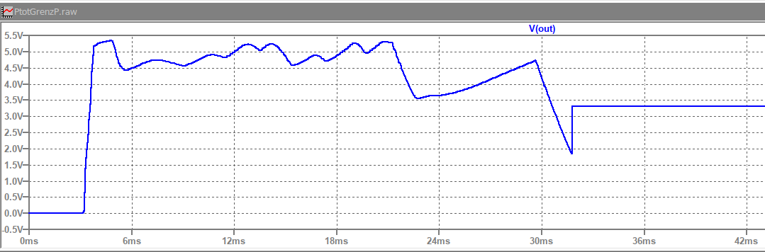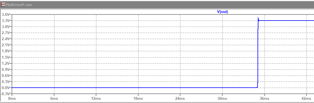 Ein paar Worte zu Netzteilen mit Ladungspumpen für die Hilfsspannungen, wie dem oben Vorgeschlagenen. Für das Beispiel dient die Simulation eines auf 3,3V Ausgangsspannung eingestellten Linearnetzteil mit LM317, der Laststrom ist 500mA. Der Trafo hat 24Veff, wird gleichgerichtet und mit 3300µF gesiebt auf den Eingang des Reglers gegeben. Um die Ausgangsspannung bis 0V einstellen zu können wird über eine Ladungspumpe aus der Trafo-Wechselspannung eine negative Hilfsspannung von 1,25V erzeugt. Um den Strom der Ladungspumpe zu begrenzen befindet sich auch noch ein Widerstand im Strompfad. Durch diese Ladungspumpe baut sich die Hilfsspannung gegenüber der Hauptspannung verzögert auf, was sich (evtl. gefährlich) störend auf die Ausgangsspannung auswirkt. Der LM317 braucht für 0V am Ausgang eine negative Hilfsspannung von -1,25V im Einschaltmoment ist die Hilfsspannung aber 0V, damit ist die Ausgangspannung um 1,25V höher als die eingestellte Spannung. Erst wenn sich die Hilfsspannung stabil aufgebaut hat, ist auch die Ausgangsspannung korrekt. Bild PtotOutD.png (D für Direkt) zeigt dieses Verhalten. Bis ca. 32ms ist die Ausgangsspannung unkontrolliert, erst danach ist sie 3,3Volt. Betroffen davon werden die meisten Netzteilkonzepte mit Ladungspumpen sein. Verhindern lässt sich dieses Verhalten indem man die Hauptspannung vor dem Regler verzögert erst dann einschaltet, wenn sich die Hilfsspannung(en) vollständig aufgebaut und stabilisiert haben. Bild PtotOutV.png (V für Verzögert) zeigt das deutlich verbesserte Verhalten, die Hauptspannung wird um ca. 35ms verzögert auf den Regler geschaltet. Hinweis: Für zyklische Messungen daran denken den Kondensatoren genug Zeit geben sich zu entladen. Mit teilgeladenen Kondensatoren misst man Mist. Tom