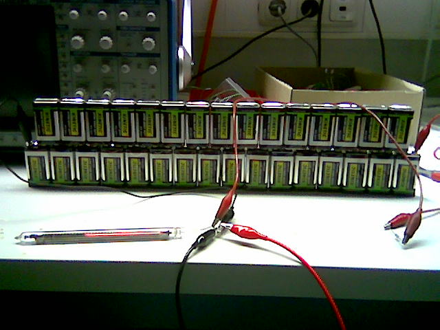 Mein kleines Experiment zeigt eine Glimmröhre mit Bedeckungsmodulation. Die Stromversorgung kommt aus 31 in Serie geschalteten 9V-Blockbatterien. Zur weiteren Verbesserung plane ich die Verwendung eines Spannungswandlers.