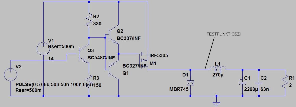 Hallo zusammen, für ein kleines Akkulader Projekt steuere ich einen Abwärtswandler per Mega8 PWM (~15kHz). Der Mega8 überwacht außerdem Ladespannung-/strom und Zellenspannung. Dabei wird regelmäßig der Tastgrad neu eingestellt, um einen konstanten Strom beim Laden zu erzielen. Das funktioniert auch alles ganz prächtig, der IRF5305 bleibt bei ~2,5A Strom durch die Last schön kalt. Auf dem Oszi fällt mir allerdings auf, daß der Abwärtswandler bei niedrigem Tastgrad (<10%) scheinbar zu Schwingungen von ~180kHz neigt (siehe Bilder). Die Frequenz der Schwingungen ändert sich, wenn ich den IRF5305 berühre. Bei einem Tastgrad von mehr als ca. 10% läuft der Abwärtswandler einigermaßen sauber. Ich hab noch ein Bild einer LTSpice Simulation angehängt. Der Mega8 fehlt, und statt dem Lastwiderstand steckt in der echten Schaltung eine Kombination aus Shunt/Diode/1.2V NIMH Zelle drin. Ansonsten sind sie identisch. Allerdings ist in der Simulation nichts von diesen Schwingungen zu sehen (trotz extrem niedigen Tastgrad von 100ns : 66us). Ich hab auch markiert, wo ich in der echten Schaltung das Oszi drangehangen hab. Mich würde jetzt interessieren, was ich da eigentlich sehe. Irgendwelche Ideen ? Danke & Gruß, Watz