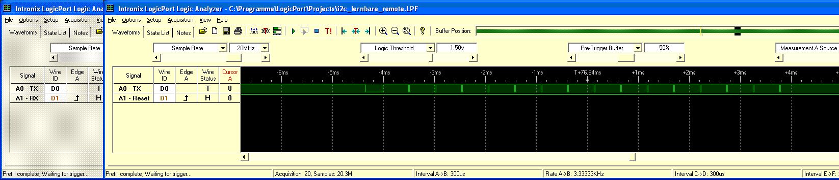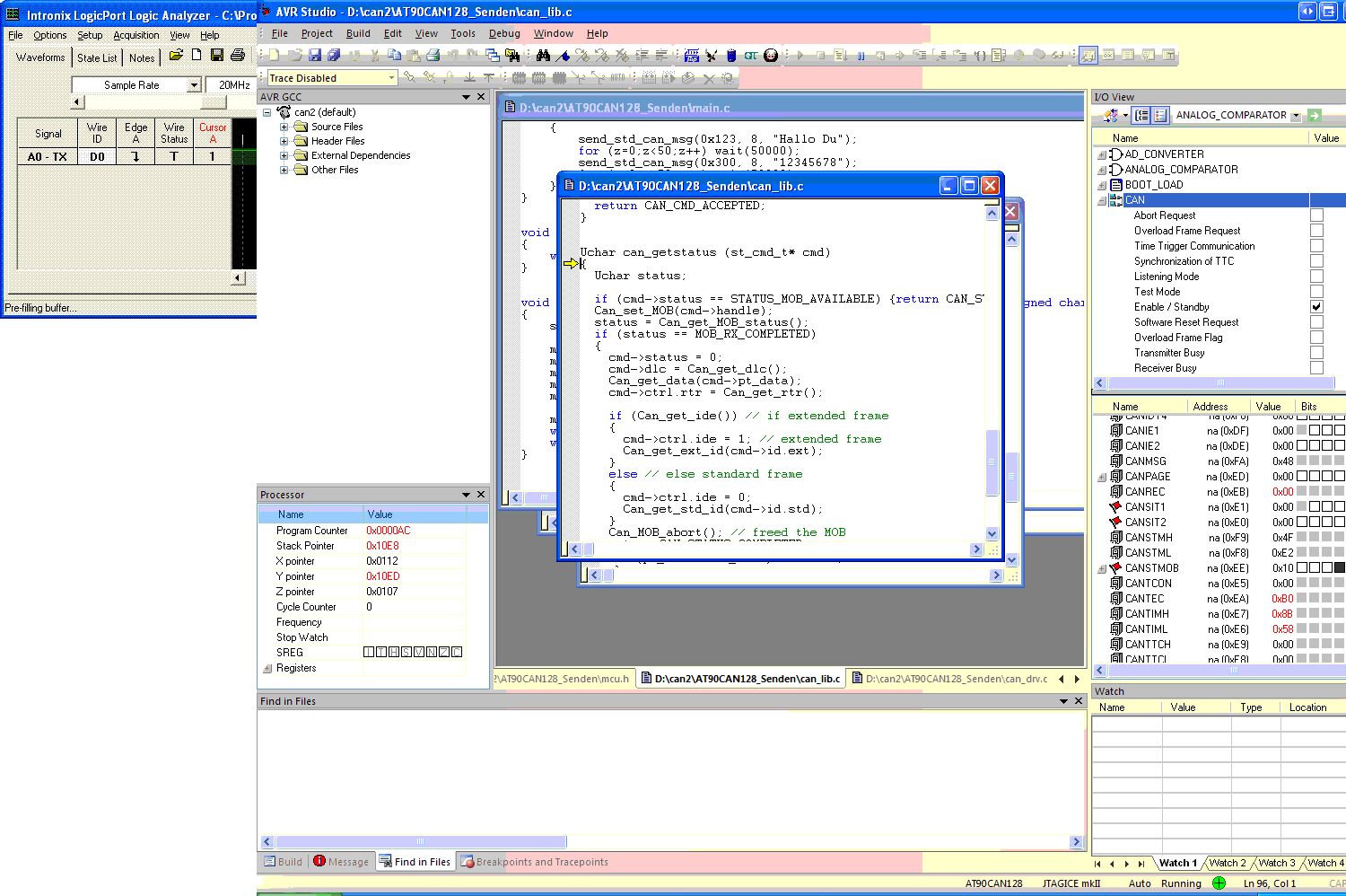 Ich habe einen AT90CAN128 auf ein STK600 gesteckt, mit 8MHz getaktet und mittlerweile 3 verschiedene Projekte ausprobiert, bei dem überall das gleiche Phänomen vorkommt. Projekte: Beitrag "CAN-Bibliothek für den at90CAN128 und das AVRStudio" Beitrag "AT90CAN128 CAN senden mit WinAVR" Beitrag ""Hello World" für CAN mit AT90CAN in C" Alle habe ich mit AVR Studio 4.18 und WINAVR-20090318 kompiliert. Wenn der AT90CAN128 das senden beginnen sollte, entsteht ein Signal wie im Anhang can.gif zu sehen. Dieser wiederholt sich immer wieder und das CANREC Register zählt bei jedem Takt Receive Errors hoch. Das CANTEC Register meldet sich ab und zu mit einem TRANSMIT ERROR wie auf dem Bild can2.gif zu sehen. Um mal den Fehler auf der Hardware auszugrenzen habe ich folgende Tests durchgeführt: - zweiten AT90CAN128 ausprobiert - gleiches Bild. - Den Canbus Anschluss vom STK600 komplett abgesteckt und die Pins TXCAN und RXCAN am AT90CAN128 miteinander verbunden, damit der Controller wirklich merkt, dass er das gleiche Signal empfängt, als er auch heraus schickt - somit kann es schon mal nicht an dem angeschlossenen Canbus und seinen Geräten darauf liegen. - Trotzdem auch mal den ADAPCAN01 an PORTD angesteckt - mit und ohne Canbus das gleiche Bild. - Alle Frequenzen von 1MHz bis 16MHz durchprobiert... Was könnte ich noch testen?