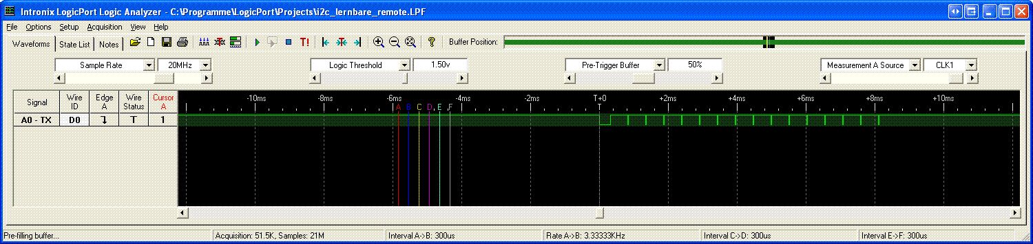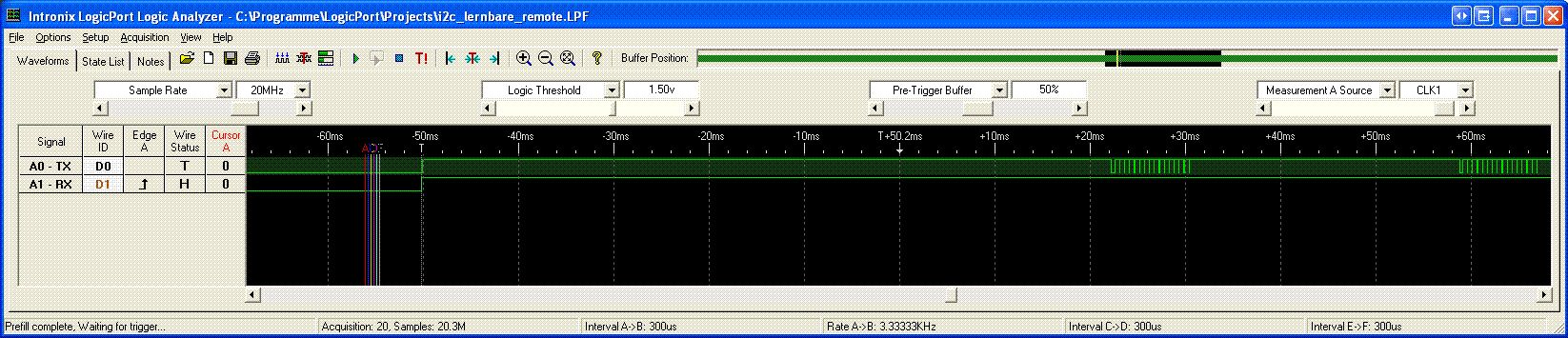 Ich habe ja auch mal testweise ganz ohen Canbus ausprobiert. Der Controller müsste doch zumindest sein SOF und 11-bit Identifier, DLC, den Inhalt und den CRC senden, bevor er auf ein ACK eines Empfängers wartet, aber selbst das wird nicht gesendet. Du siehst auf can.gif, dass er nur ein ca 300µs langes LOW singal von sich gibt und danach keine Identifier Adresse folgt... Auch nach dem Einschalten / Reset sieht das erste Signal so aus... Ich sehe es ja ein, dass er ein Arbitratiostest macht, aber dann sollte er doch alles als OK befinden, wenn TXCAN und RXCAN miteinander verbunden sind, oder nicht?