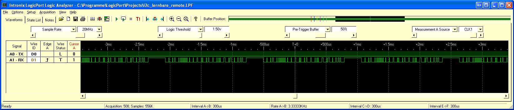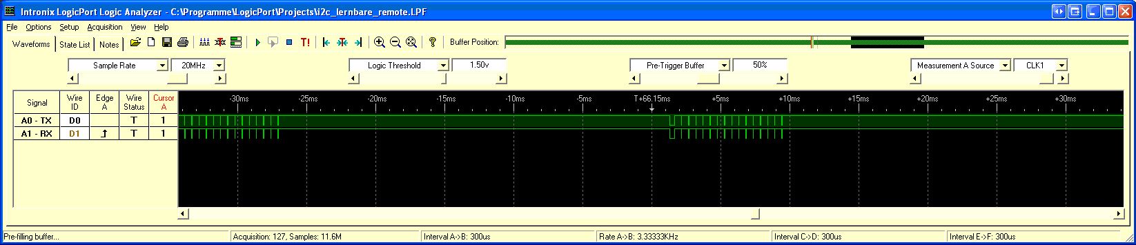 Mit einem IXXAT USB-To-CAN auf der anderen Seite sieht es genau so aus. Hier nochmal ein Bild (can5.gif) vom TXCAN und RXCAN vom AT90CAN128, wenn der IXXAT noch mit auf dem Bus ist. Kein Unterschied. Dann habe ich mal den TXCAN vom Controller abgehängt und den IXXAT senden lassen. Dieser wäre ja jetzt auch alleine auf dem Bus. Da erkennt man sofort, dass eine ID und Daten gesendet werden, bis er beim fehlenden ACK abbricht. Der AT90CAN128 sollte sich genauso verhalten, wenn er alleine auf dem Bus ist - zumindest bei der ersten Sendung gleich nach dem Reset...