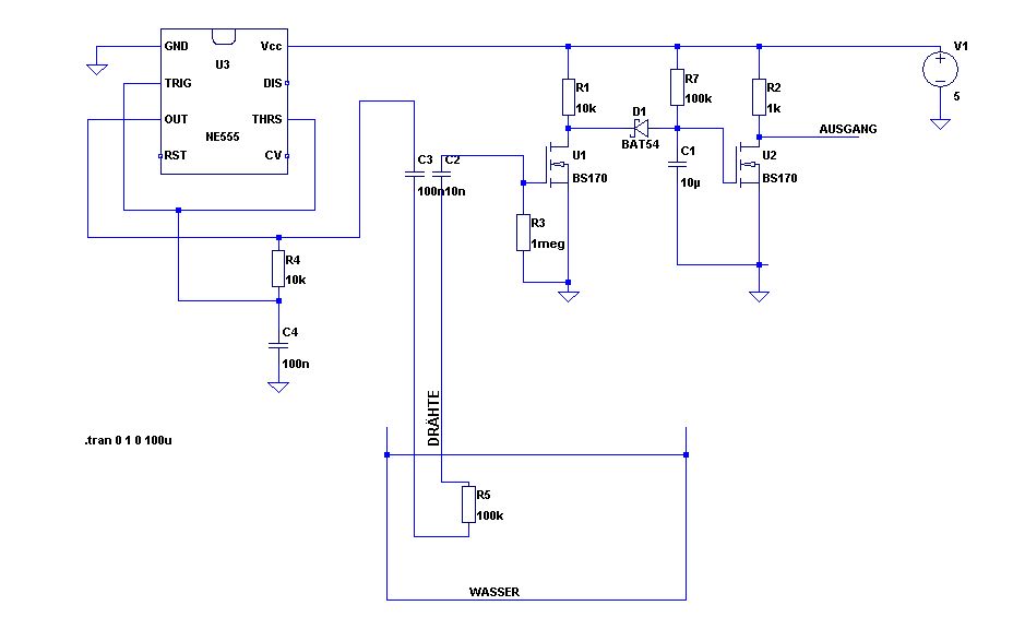 > Kondensatoren, die bekanntlich Gleichstrom nicht durchlassen, der Gleichstromanteil des Rechtecksignals abgesperrt werden. Ist nicht das gesamte Rechtecksignal ein Gleichstromsignal (>= 0V)? Der Strom fliesst in einer Richtung. Um Elektrolyse zu verhindern, müsste er doch mal in die andere Richtung fliessen?! > 50-Hz Spannung dürfte an der Messelektrode normalerweise nicht eingestreut werden, schließlich bildet der Kessel eine Abschirmung Ich habe andere Erdungspunkte (z.B. ISP-Kabel, USB). Wenn der Boiler auf GND liegt und das Wasser leitet - funktioniert die Schaltung dann noch? > Wenn nicht der Füllstand gemessen wird, sondern nur, ob leer oder voll Es wird gemessen, ob der Wasserstand unter den Nachfüll-Level gesunken ist.