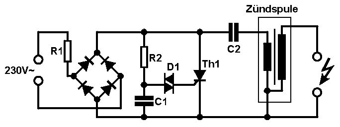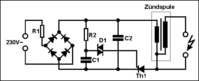 Sehe ich das richtig, dass die Zündspule nur zwei Anschlussdrähte und einen Hochspannungsanschluss hat? Wenn das so ist, wäre deine Bauteilsammlung beim Betrieb an 230V lebensgefährlich. Die Zündspule hat dann nämlich für Primär- und Sekundär-Wicklung nur einen gemeinsamen Masseanschluss. Beim Betrieb an 230V liegen alle Anschlüsse deiner Zündspule auf Netzspannungspotential, wenn du keinen Trenntrafo verwendest. Ausserdem brauchst du noch zwei zusätzliche Bauteile, einen Gleichrichter und einen Vorwiderstand. Die klassische Schaltung dazu habe ich mal angehängt. Du musst auch noch herausfinden, welcher Draht der gemeinsame Masseanschluss ist, der rote oder der blaue. R1 in meiner Schaltung ist der fehlende Vorwiderstand, z.B. 4k7/5 Watt. C1 ist der kleinere Kondensator aus deiner Sammlung, C2 ist der größere Kondensator. D1 ist der Diac (das Teil mit nur einem Ring), R2 ist dein Widerstand (das Teil mit den vier Ringen), Th1 ist der Thyristor (das schwarze Teil mit den drei Beinen). Du kannst diese Schaltung aber nur betreiben, wenn sowohl der Hochspannungsanschluss als auch der Masseanschluss der Zündspule gut isoliert und gegen Berührung gesichert sind. Andernfalls wäre das, wie gesagt, lebensgefährlich, weil die gesamte Schaltung auf Netzpotential liegt. Sämtliche Angaben sind ohne Garantie, Verwendung der Schaltung auf eigene Gefahr. Wenn du nicht wirklich weisst, was du tust, lass' es lieber.