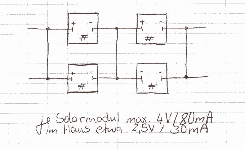 Hallo, will 4 Solarzellen so verschalten, dass diese immer eine möglichst hohe Spannung produzieren. Im Anhang befindet sich das Bild zur geplanten Verschaltung wobei sich die jeweils diagonal befindlichen Zellen zusammen auf einem Panel befinden und mit dem anderen 2er Panel immer in entgegengesetze Himmelsrichtungen strahlen (Fahrzeug). Habe ich einen Denkfehler oder ist dies die beste Verschaltung für diesen Zweck? -- Weiterhin sollen die Solarzellen bei Beschattung (etwa 5V) ihre Spannung direkt an meine Logikschaltungen wie Mikrocontroller etc. einspeisen und bei voller Bestrahlung (bestenfalls 8V) per Spannungsregler einen LiFePo- Akku (2Zellen in Reihe) laden (geregelt auf 7,2V).