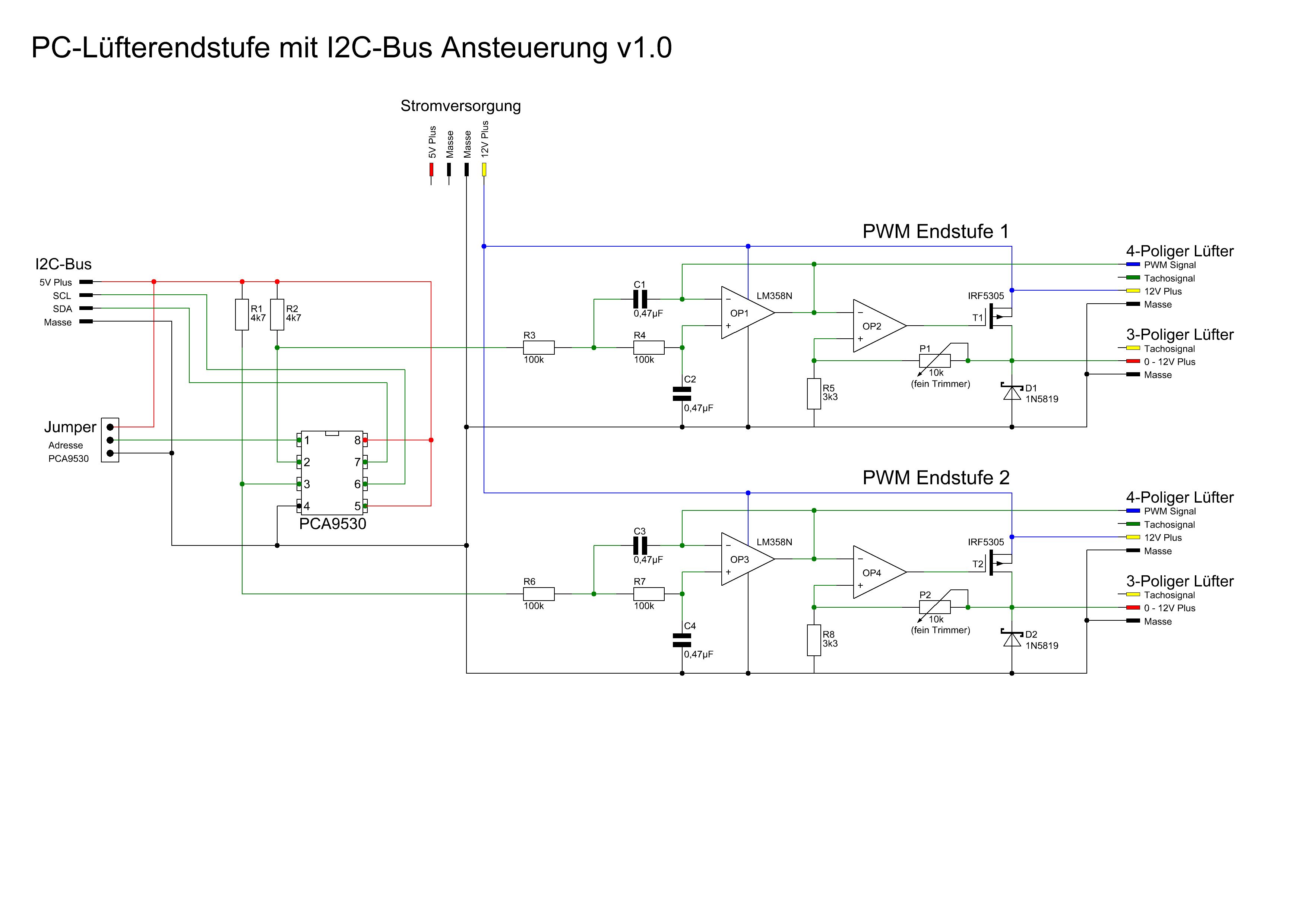 Hallo Olaf! Die 4-Poligen Lüfter werden mit einer PWM-Frequenz von ca. 25KHz angesteuert. Die Ansteuerung hat hierbei TTL-Pegel, also 5V. Die Lüfter an sich werden aber mit 12V betrieben. Fehlt das PWM-Signal oder ist die Tastrate zu gering, dann dreht der Lüfter mit ca. 30% seiner Drehzahl. Man kann also mit dem PWM-Signal die Lüfterdrehzahl von ca. 30% bis 100% einstellen (auf 0% lassen sich die 4-Poligen Lüfter also nicht einstellen). Ich hatte damals auch mal damit ein wenig experimentiert, war aber alles nicht das gelbe vom Ei. Anbei mal meine damalige Ansteuerung, die funktioniert für 3-Polige und 4-Polige Lüfter… LG Jens