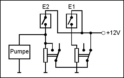 Für so eine einfache Aufgabe brauchst du aber wirklich keine komplizierte Elektronik. Das kann man ganz einfach mit zwei Reedkontakten in einem Kunststoffrohr, einem ringförmigen Magnetschwimmer auf dem Rohr und zwei Relais lösen, siehe Schaltung im Anhang. Die Reedkontakte schliessen dann, wenn der Magnetschwimmer in unmittelbarer Nähe ist. Wenn der untere Kontakt (E2) schliesst, bekommen das linke Relais und die Pumpe Strom. Das linke Relais bleibt so lange durchgeschaltet, bis der obere Kontakt (E1) schliesst, dann wird der Ruhekontakt des rechten Relais geöffnet, das linke Relais fällt wieder ab und die Pumpe wird ausgeschaltet. Du musst bloss einen laugenfesten Magnetschwimmer besorgen und das Kunststoffrohr mit den Reedkontakten so abdichten, dass keine Flüssigkeit hineinlaufen kann. Wenn die Pumpe einen großen Strom zieht, bei der der Reedkontakt überlastet wäre, muss man für das linke Relais halt eine zweipolige Ausführung vorsehen, damit der Reedkontakt nur den Relaisstrom schalten muss. Der zusätzliche zweite Kontakt des Relais schaltet dann den Pumpenstrom. Die Anzeigeschaltung für den linken Tank kann man ebenfalls mit Reedkontakten und Magnetschwimmer lösen, da braucht's keine komplizierten Infrarotsensoren oder ähnlichen Schnickschnack.