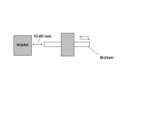 Hallo Lothar, Danke für die schnelle Antwort. Ich habe mal via Paint eine grobe Skizze angefertigt. Die Größenverhältnisse sind nicht korrekt, aber ich hoffe, dass du so eine Vorstellung von der Anordnung bekommst. Der Bolzen kann vor und zurück gefahren werden. Deine Frage nach dem Bolzenmaterial lässt darauf schließen, dass du den Sensor ggf. am Würfel unterbringen willst. Adhoc kann ich dir die Frage nicht genau beantworten. Die Farbe ist weiß, evtl. Aluminiumoxid. Platz sollte ausreichend vorhanden sein (ca. 5 cm rechts/links vom Bolzen). Der Würfel ist 2 cm breit. Die Frage wie schnell die Messung ablaufen muss, kann ich jetzt noch nicht pauschal beantworten. Aus der Hüfte geschossen wären weniger als 50 ms nicht schlecht. Das soll an dieser Stelle aber erstmal kein harten Ausschlusskriterium sein.