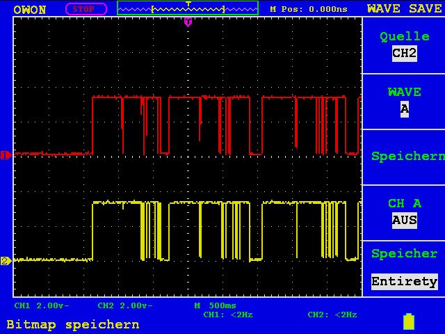 Hi! Anscheinend kann der Chip von dem Bus lesen und schreiben. Man kann das mit einer einfachen Schaltung sichtbar machen: Kleiner Widerstand (~100 Ohm) in Reihe zu den Datenleitungen. An den Enden des Widerstands jeweils ein Anschluss eines Komparators anschließen. Als Komparator kann man auch einen OP ohne Rückkopplung verwenden. Der Komparator bzw OP müssen aber mit Spannungen nahe 0V zurechtkommen (Rail to Rail). Die Spannung am Ausgang des Komparators gibt die Richtung der Daten an. Es geht natürlich nur, wenn beide ICs einen Open Kollektorausgang haben. Gruß PP