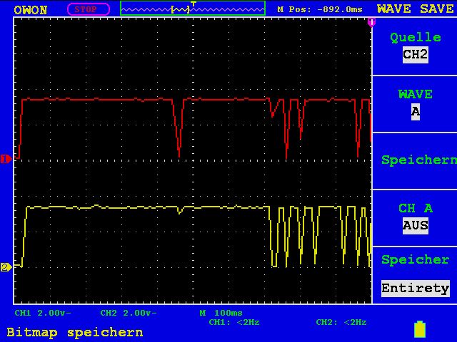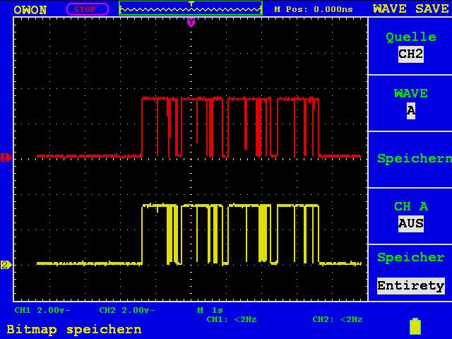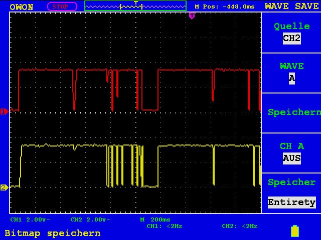 1. Ich habe mir eine leer Patrone von einem anderen Drucker besorgt. Diese wird auch in meinem Drucker als leer erkannt. -> Es muss also der Status der Patrone auf dem Chip gespeichert werden (Ich schließe mal aus, das sich der Drucker diese Info von einer Datenbank im Netz zieht). 2. Es spricht einiges für I2C. Jedoch kann ich auch nach intensiver Suche mit dem Oszi keine Start-Bedingung finden. Die Flanken von SCLK und SDA liegen scheinbar immer exakt aufeinander. Kann dies der Hinweis auf einer anderen Bus sein? 3. An der Seite der Patronen befindet sich eine Zahnrad, über das eine Scheibe bewegen lässt. Diese Scheibe ist mit über 180° mit einem Spiegel versehen. Die andere Hälfte ist schwarz matt. Im Druckern befindet sich offenbar eine Lichtschranke, die den Spielgel und somit die Position des Zahnrades erfassen kann. Hat schon jemand beobachten können, wie oft der Drucker an dieser Scheibe dreht bzw. wie weit er an diese dreht? Trägt diese Scheibe irgendwie zur Füllstanderkennung bei? Es bleibt also spannend. Gruß und bis bald....