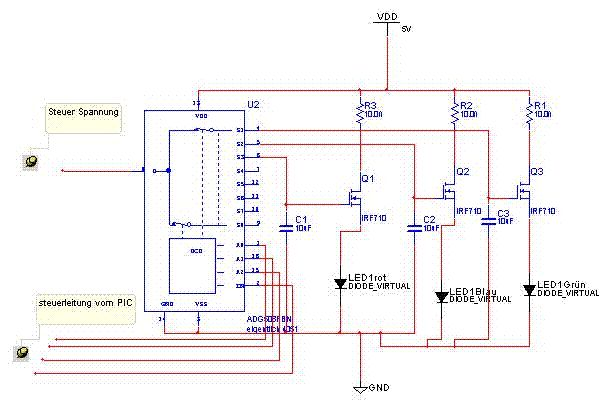 Moin Ich will mit einem Pic16f874 4 Pol Rgb Led's ansteuern. Exemplarisch hab ich mal meine Idee fuer eine Led gezeichnet. Widerstände und Kapazitäten muss ich noch berechnen. Als Analog Multiplexer wollte ich nen 4051 nehmen. Geht das so. Also meine idee ist ich lade den jeweiligen Kondensator springe zum naechsten Port des MUX lade den nächsten. der Kondensator soll dann den Mosfet solange steuern bis er einen neuen Steuer impuls erhält. Wie ist das wenn ein Port des Mux gerade nicht gewält ist liegt der dann auf masse oder ist der dann halbwegs gut vom Stromkreis getrennt. Vielleicht gibts ja auch einfachere Varianten. vielen Dank aber erstmal für Antworten Felix