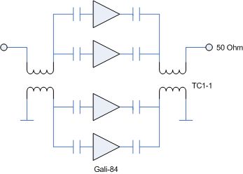 Hallo, ich brauche einen großsignalfesen Verstärker der bis 300MHz hoch geht und ziemlich weit runter, mindestens bis 100kHz, besser wenn noch weiter. Weil die 2.Harmonische durchaus genauso wichtig ist ist wie der IP3 dachte ich an ein Gegentakt-Design. Der Hela-10 von Minicircuits bietet sowas, allerdings begrenzen die Trafos für die Symmetrierung die Bandbreite nach unten auf ca. 3 MHz (siehe erstes Bild). Ich dachte mir dass mit Transmission Line Trafos als Symmetrierer unterhalb der Grenzfrequenz der Trafos zumindest der obere Zweig aktiv bleibt (zweites Bild), so dass zwar die Anpassung, die Verstärlung und der IP2 schlechter werden, aber zumindest überhaupt Signal durch geht. Konnte ich auch in einer ersten schnellen Messung bestätigen. Bei der Auswahl der Trafos habe ich eine Frage. Ich hab einfach 1:1 Trafos genommen die gerade da waren. Die Suche nach Transmission Line Trafos für den Frequnezbereich (100kHz bis 300MHz) war nicht wirklich erfolgreich. die 1:1 Trafos gingen durchaus leidlich, nach meinem Verständnis werden Transmission Line Trafos anders gewickelt: Als Twisted Pair Leitung (mit 50 Ohm?) die um den Kern gewickelt wird. Kennt jemand Quellen für TLT in dem Frequnezbereich (möglichst tief bis 300MHz)? Selber wickeln ist leider kaum eine Option, wegen der gerinen Stückzahl und der der begrenzten Zeit will ich da eigentlich nicht das Basteln anfangen. Randy