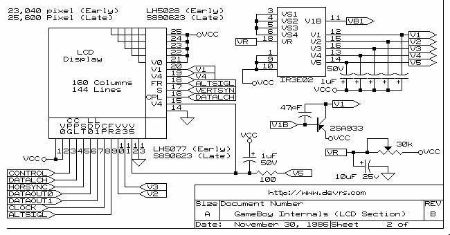 Hier mal die Displaysektion des Gameboy. Ist aber nicht einfach, da sowohl T6963 als auch SED1330 nicht in Frage kommen, da das LCD anscheinend 2 Bit Daten braucht.