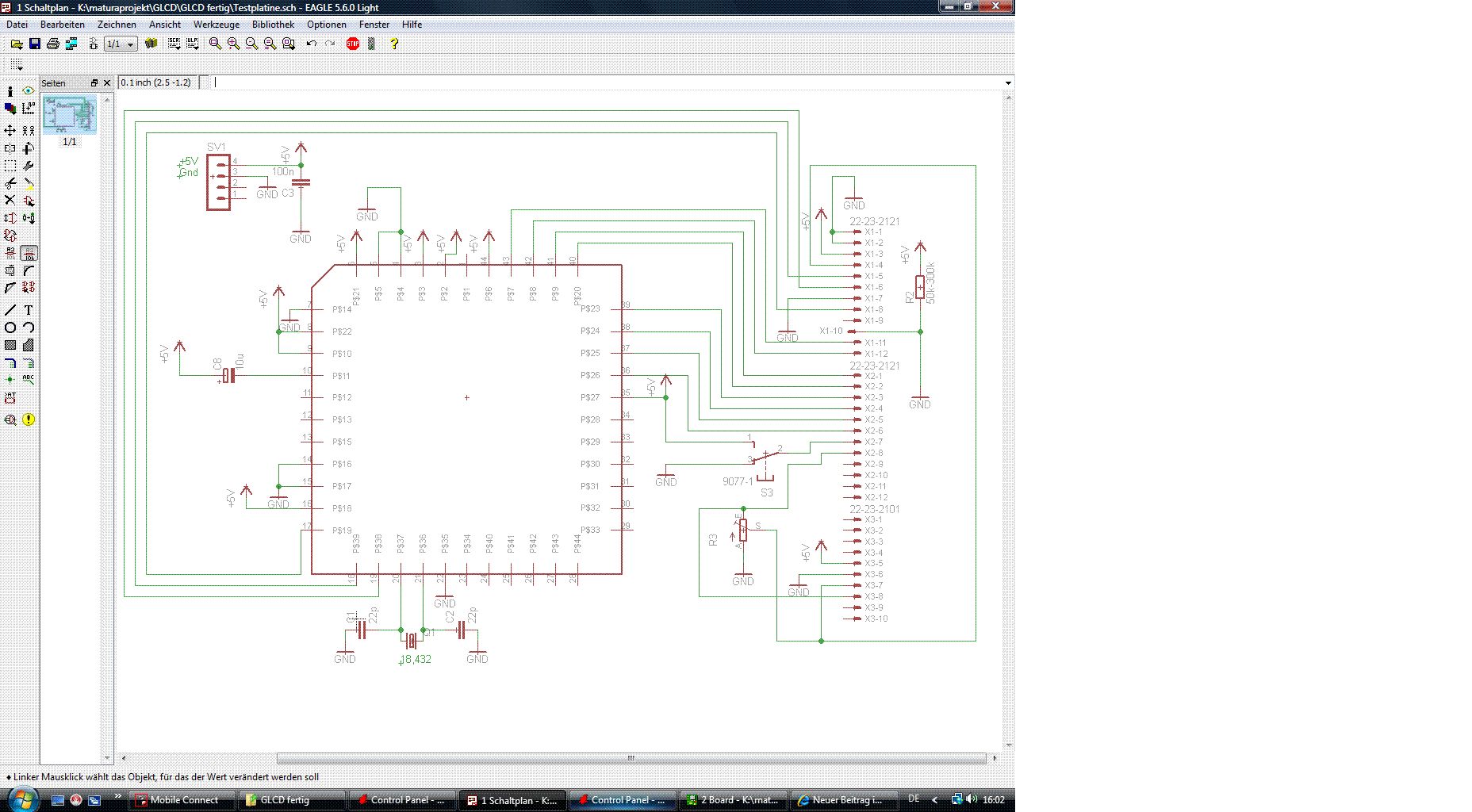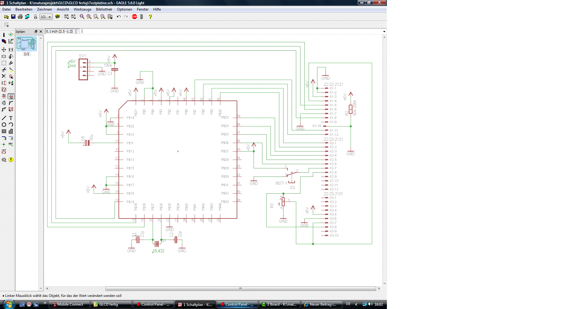 Hi Leute, ich hab ein Problem mit dem Grafikcontroller IC6963. Datenblatt vom IC6963, vom verwendeten GLCD und Schaltplan habe ich angehängt. Momentan möchte ich einfach nur einmal den Testmodus des GLCD´s ablaufen lassen. Dazu muss, so habe ich das verstanden, PIN 15 auf Gnd gelegt werden. Bei einem Einschalten, oder Reset, sollte der Testmodus angezeit werden. Das funktioniert leider nicht. Das GLCD gibt nur waagrechte Streifen aus. Diese Streifen sind nach jedem Reset anders. Ich hab auch ein Foto davon beigefügt. Die Verdrahtung des ICs und des GLCDs sollte richtig sein :) °Pin 2,3,4: High High Low (Baud Rate: 57600) °Pin 5,6: Low High (richtig?) °Pin 7,8,9: Low High High (Display Size (240x128) °Pin 10 Reset, mit Kondensator auf Low (laut Datenblatt) °Pin 11,13 zum Pic (Rx und Tx, momentan ist kein PIC angeschlossen, aber das dürfte doch nicht der Grund sein, oder?) °Pin 14, 15 Low Low (CTS und RTS) °Pin 16 High (Quarz Typ= 18.432Mhz) °Pin 17,18,19 alle zum GLCD °Pin 20, 21 Quarz °Pin 24 - 31 Nicht gebraucht, sind soweit ich weis für die Funktion auch nicht wichtig °Pin 36 - 43 Display: Data lines, alle mit GLCD verbunden. Ich hoffe jemand findet einmal die Zeit kurz drüberzuschauen was falsch ist. Hab leider überhaubt keine Erfahrung mit GLCDs, auch die Erfahrung mit PICs lässt zu wünschen übrig. Das ganze ist ein Schulprojekt. Die eigentliche Programmierung macht mein Projektpartner, ich bin eigentlich nur für die Hardware zuständig. Danke schon mal im Vorraus.