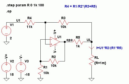 U2 ist dabei die Spannung an den beiden Eingängen des OpAmps und U3 des- sen Ausgangsspannung. Aufgelöst nach UA und sortiert nach Termen ohne und mit I2 ergibt sich