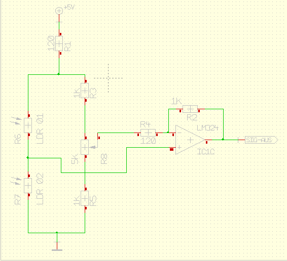 Also ist es jetzt ein Differenzverstärker mit Messbrücke? Wie genau gleiche ich mit dem Poti die Schaltung ab? Gleiche ich die Schaltung ab, wenn die LDRs beide gleich beschienen sind? Ich habe bis jetzt immer die halbe Betriebsspannugn an dem Poti eingestellt, also 2,5V, denn das fällt ja auch bei den beiden LDRs ab, wenn beide gleich beschienen werden, oder?