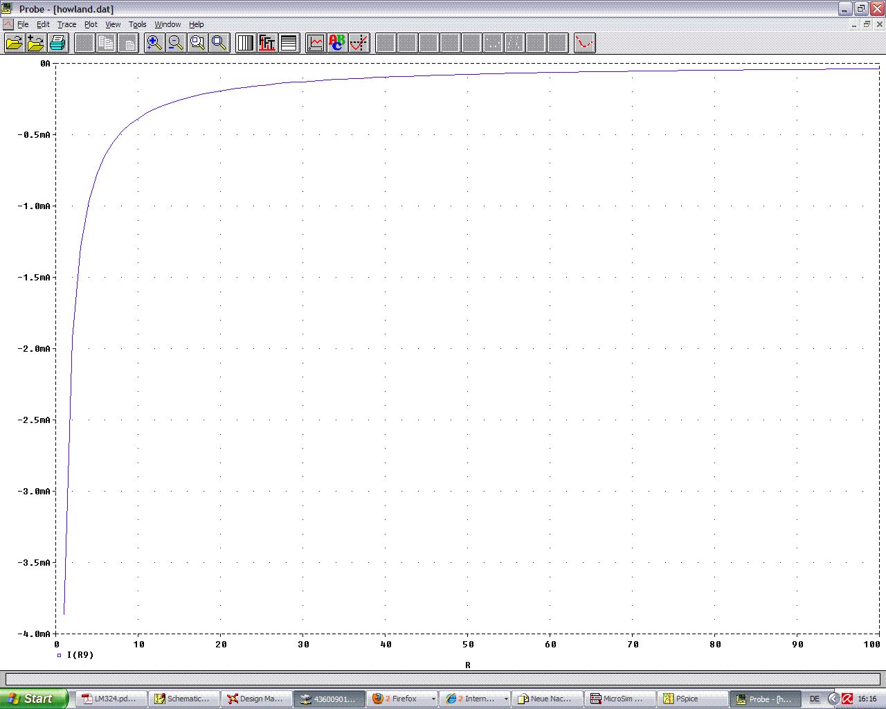 Hi Johnny, hab deine Schaltung mal schnell in MSim simmuliert und nun weiß ich was du benötigst! Im Anhang ist die Auswertung der Schaltung und die Stromänderung ist eindeutig nicht linear! Deshalb würde ich dir einen Spannungs-Strom-Wandler empfählen! Ganz genau weiß ich nicht, ob du dein Problem mit einem Spannungs-Strom-Wandler lösen kannst, aber es ist auf jeden Fall besser als deine Lösung mit der Howland Current Source! Schau mal bei NS vorbei, die solten normalerweise solche Wandler haben! Habt ihr sonst noch eine Ahnung, wie er sein Problem lösen könnte? Ich bin ehrlich gesagt auch überfragt! (Amateur) mfg
