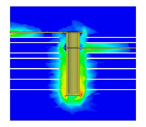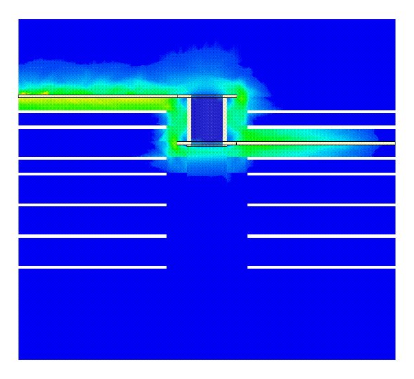 So ich habe es mal für euch simuliert. GIF Animation gibt es im Anhang. Wie man sieht ist die Schirmung durch Masseflächen so gut, dass kein Feld nach außen dringt.