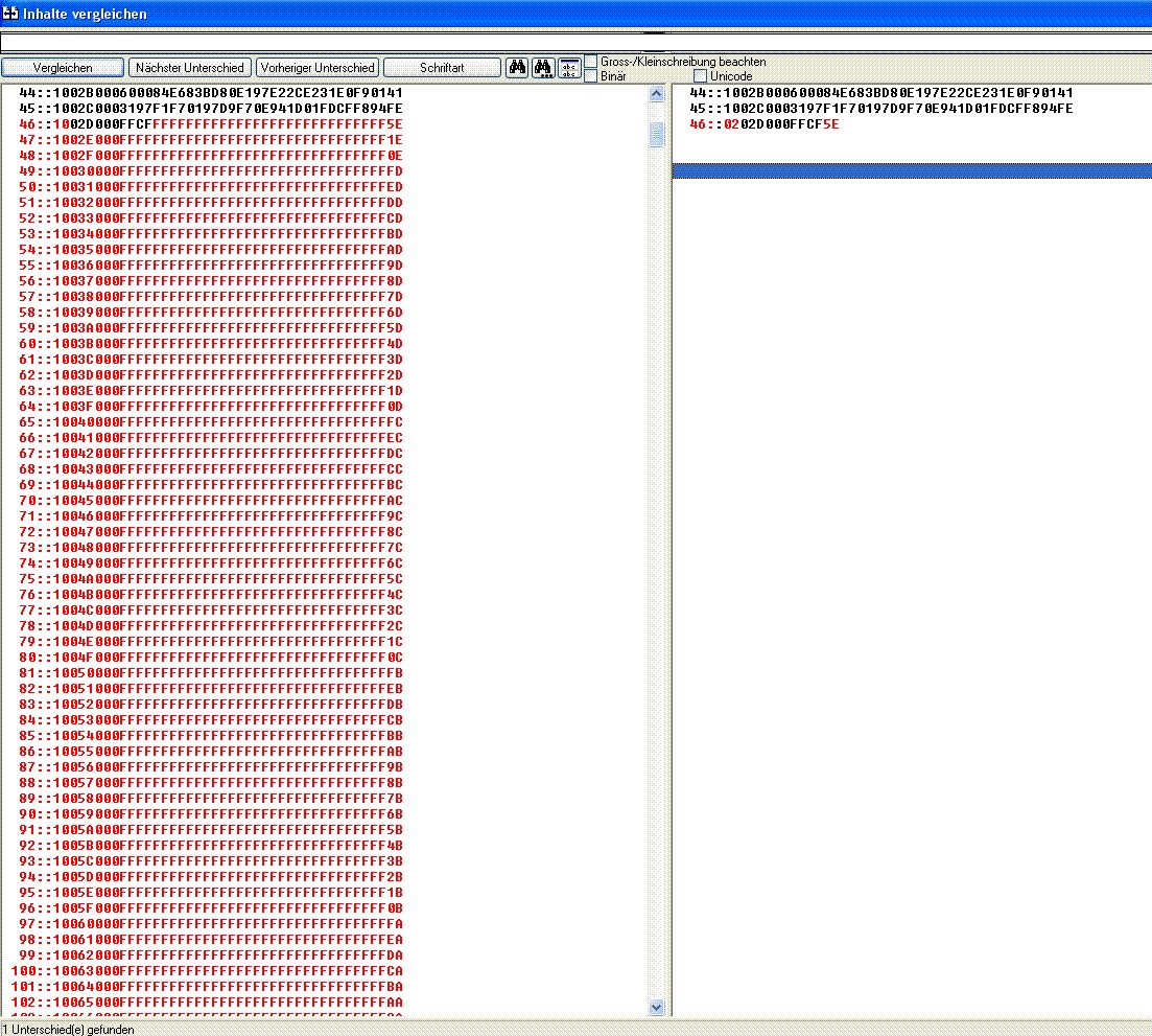 Hallo Kollegen, kurze Frage: Wenn ich den Inhalt der compilierten HEX-Datei mit dem vergleiche, was nach dem Beschreiben des Controllers auf diesem vorhanden ist, findet sich immer ein Unterschied in der letzten Zeile. Siehe Bild! Warum ist das so?