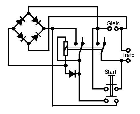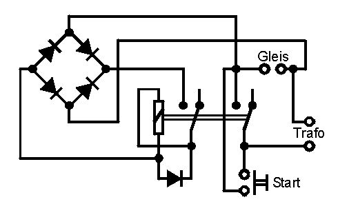 Wenn ich das richtig verstehe, ist die Spannung auf den Gleisen in gewissen Grenzen immer gleich und die Fahrtregelung passiert über digitale Steuersignale. Alles was du ausser dem Gleichrichter noch brauchst, ist ein Relais mit zwei getrennten Umschaltkontakten und ein Taster, sicherheitshalber auch noch eine Freilaufdiode über der Relaisspule. Die Spulenspannung des Relais sollte ungefähr der gleichgerichteten Gleisspannung entsprechen. Das Relais schaltest du über einen der Umschaltkontakte als selbsthaltendes Relais, das bei Betriebsbeginn durch Drücken des Tasters anzieht. Über den freien Umschaltkontakt wird deine Betriebsspannung auf die Gleise geschaltet. Wenn es einen Kurzschluss gibt, bricht auch die Spannung an der Relaisspule zusammen, das Relais fällt ab und trennt das Gleis vom Trafo.