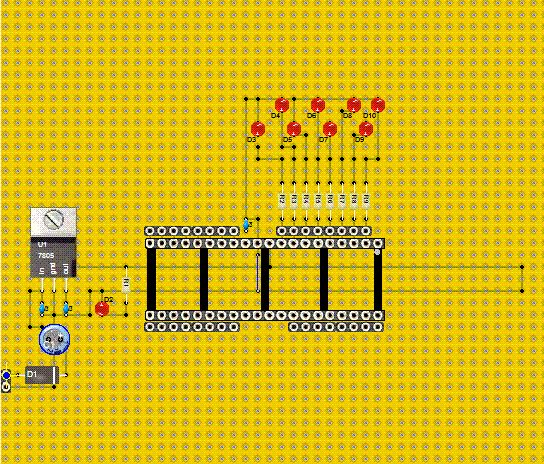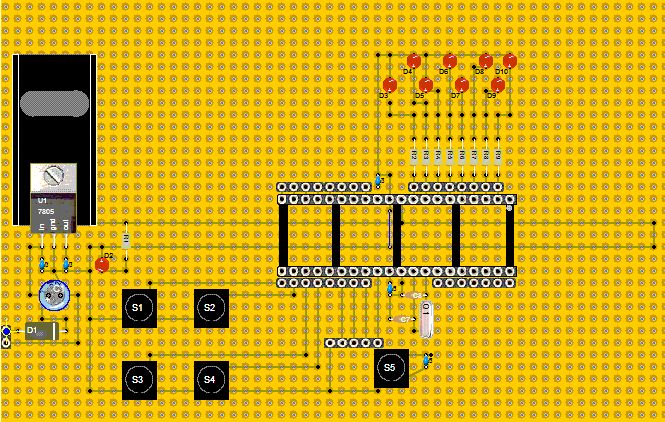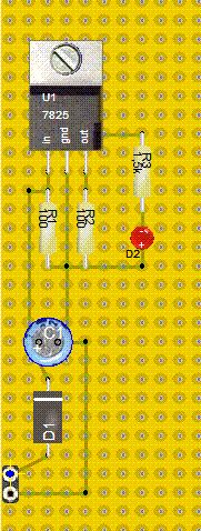 Die LED ist falschrum eingezeichnet. Wenn Du R1/D2 um vier Reihen nach unten verschiebst, wird es einfacher, unter dem 7805 im Notfall noch einen Kühlkörper anzubringen (und Du sparst ca. 16mm Draht ;-)