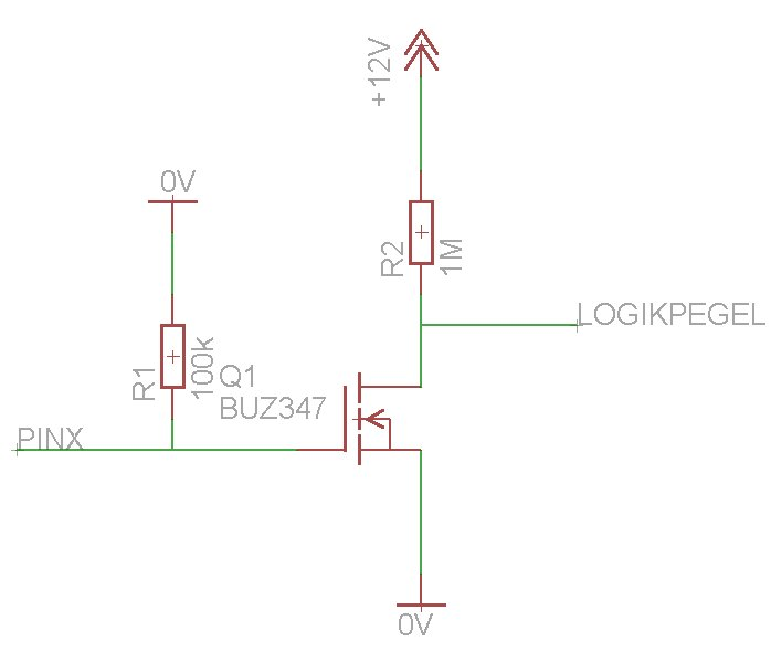 Hallo, ich habe auf meiner Platine 12V zur Verfügung und will mit einem I/O Port des µC 12V Logikpegel für ein anderes Bauteil schalten. Mir ist aber nicht so ganz klar, was ich dabei zu beachten habe. Anbei mal mein Versuch das Problem zu lösen. Da ich ja keine Last an Source bzw. bei einem NPN Transistor an den Emmiter anschließen kann, und ich nicht weiß, wie das anzusteuernde Bauteil intern funktioniert, würde ich einfach eine sehr große Last an Drain anschließen und von dort aus meinen Logikpegel abgreifen. Funktioniert das so? Gibts ne bessere Lösung? PS: Der N-Kanal Mosfet-Typ ist nur exemplarisch in der Zeichnung.