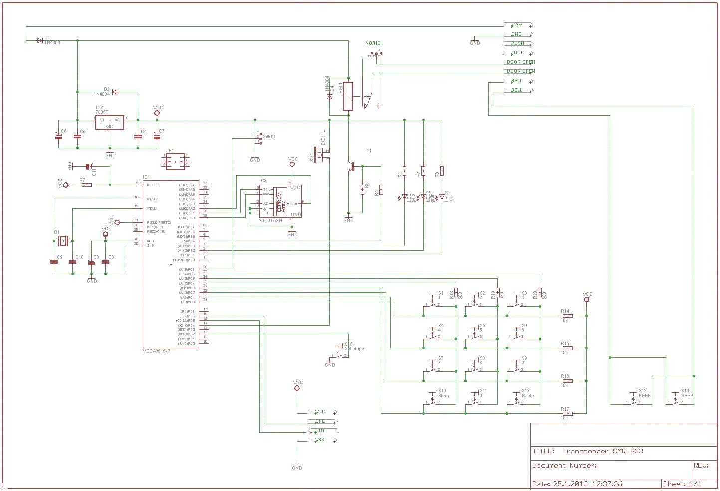 Würde mich interessieren, was aus dem Projekt geworden ist, habe gerade auch von Conrad ein Codeschloss mit RFID (AEI DK-9206) vor mir, verbaut ist die gleiche Schaltung (HC74393 und CD4069, nur 4 Mhz Quarz) und ich kann in einer Schleife mit Bascom 0 und 1 auslesen, die RFID-Routine von Bascom geht nicht. Auf einer Huckepackplatine befindet sich ein Atmega8 und ein serielles EEprom 24C64, auf der Tastatur eine sehr eigenartige Matrix (6 Anschlüsse für 12 Tasten, dabei sind die Tasten 0, * und Raute zwischen den Spaltenanschlüssen geschaltet..) Hat es jemand geschafft, den Rohdatenstrom in Bascom zu dekodieren? Diese Codeschlösser sind superfertig mit Gehäuse und Tastatur, allerdings völlig unbrauchbar: wenn ich es aufschraube, kann ich die Relaiskontakte kurzschließen und "einbrechen" - ein Codeschloss ist nur sinnvoll mit Außen- und Innen/Decodierstation, in meinem Fall soll noch ein Logging dazukommen.