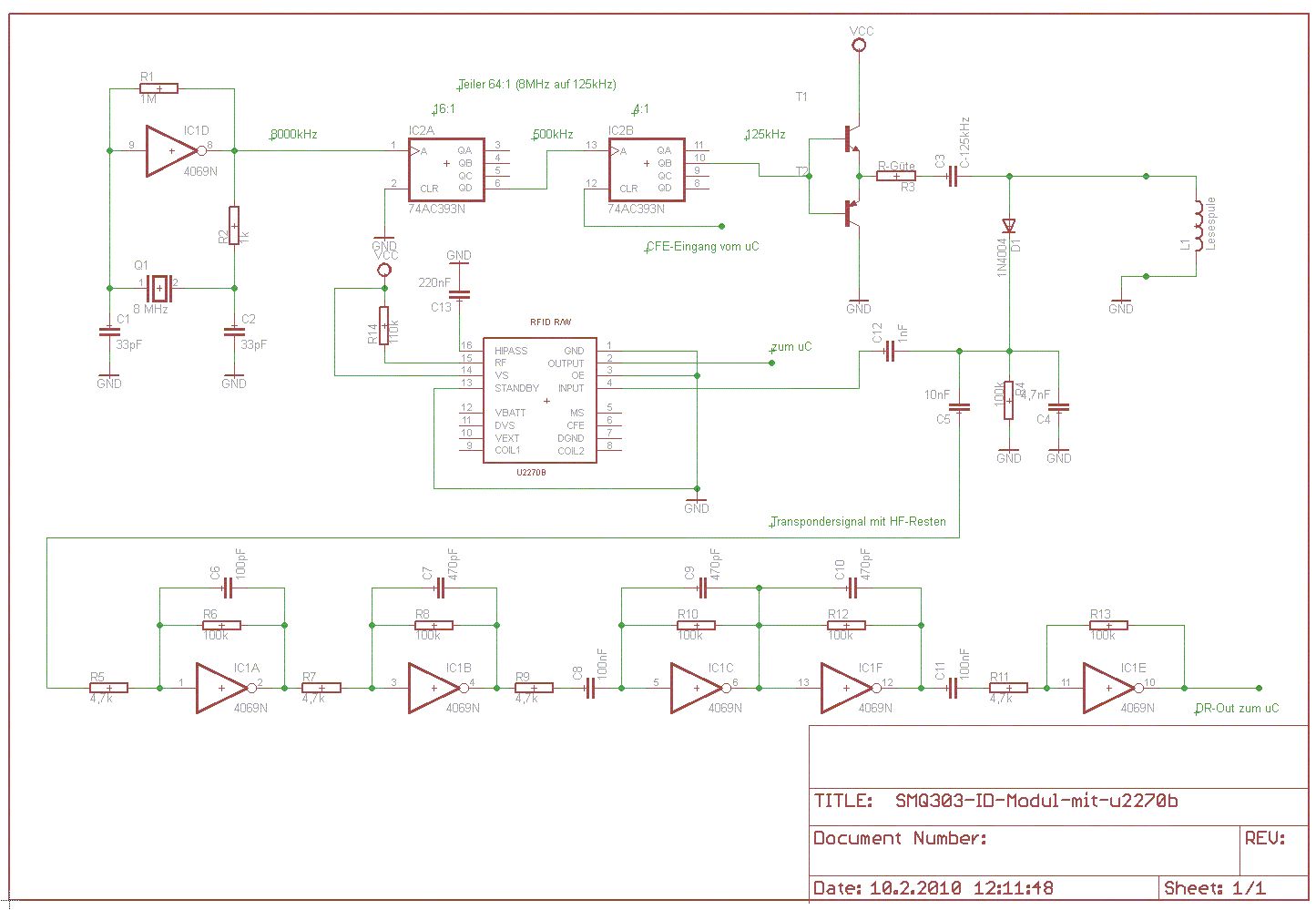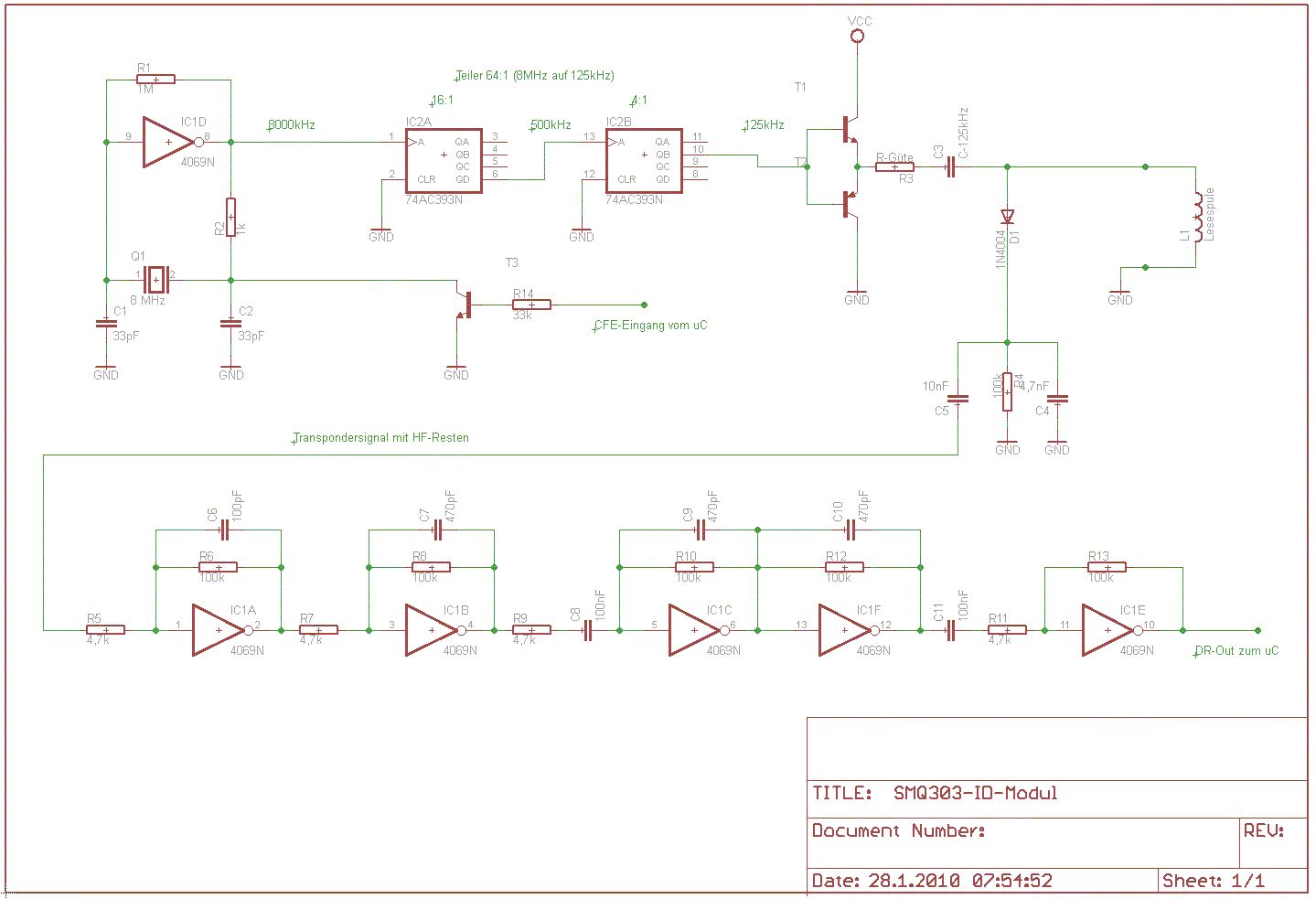 naja, nachbauen will ich eigentlich gar nichts. Der Reader wie in den 2 Zeichnungen abgebildet liegt bei mir auf dem Schreibtisch. Mein Problem ist, das das Signal aus dem ID-Modul offensichtlich nich völlig identisch mit den Signalen vom U2270/EM4095 ist. Im Prinzip kommt bei den beiden IC-Typen am Ausgang das gefilterte und "digitalisierte" RFID-Signal raus. Nichts anderes macht diese diskret aufgebaute Schaltung. Ich hatte nun die Hoffnung, dass ich mit der Bascom-Lib em4095.lib die Hitag-Funktion nutzen kann und das Signal einfach einlesen kann. Dann brauch ich hardwaretechnisch nichts zu verändern. Geht das nicht, muß ich das ID-Modul rauslöten und durch ein kleines em4095-Modul ersetzen. Die Große Spule im Gehäuse kann ich ja weiterverwenden. Schön wäre eben, wenn jemand sagt "kenn ich, hab ich schon so mal gemacht" Wenn das klappt, will ich 9 Stück davon vernetzen. Da ist Hardware-Aufwandsminimierung schon sinnvoll.