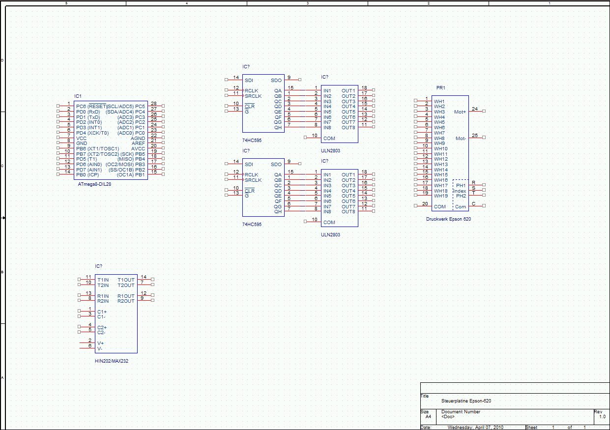 2xULN2803 gibt nur 16 Ausgänge. Da fehlt dann mindestens noch etwas für den Motor --und für die zwei Typenräder mit den Symbolen, wenn man die auch nutzen will. 3xULN2003 trifft es da meiner Meinung nach besser. Ich muß aber zugeben, daß ich die Ansteuerung des Motors nicht nachgerechnet habe. Das Fehlen von Rauchzeichen bisher ist ja noch kein Beweis für korrektes Schaltungsdesign. Beim Schieberegister stört mich noch, daß ich so viele Pins zur Ansteuerung benutze. Entweder /OE oder RCK sollte man einsparen können. Allerdings weiß ich noch nicht, wie man dann sicherstellt, daß die Ausgänge alle tot bleiben, solange noch keine Software im AVR läuft. Bei den Sensoren würde ich den Common-Anschluß auf einen Interrupteingang legen (anstatt direkt auf Masse, wie ich das zuerst gestöpselt habe). Dann kann die Software sich aussuchen, ob sie den Common auf Masse legt und die Sensoren per Polling abfragen will, oder den Sensoranschluß, auf den sie wartet, auf Masse legt und sich einen Interrupt geben läßt, wenn der Kontakt schließt. Bei der Spannungsversorgung wäre es wichtig zu wissen, ob man AVR und die ganzen induktiven Lasten (Motor&Magnete) an dieselbe 5V-Quelle hängen darf oder wie weit man das entkoppeln muß. Möglicherweise tun es für die Mechanik auch ungeregelte 6V, mit denen man dann nebenbei noch einen Regler für die Versorgung der Logik speist. AVR und Schieberegister sollten ja auch mit weniger als 5V auskommen können, oder?