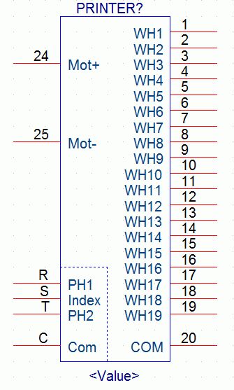 Hi Leute, Ich hab' bei dem Preis auch nicht widerstehen können und so'n Druckwerk geordert. ;-) Im Anhang mal ein paar Bildchen zur Pinbelegung und dem Timing der Sensorik (Signale R,S,T wie im Schaltplansymbol). Die "WH"-Pins sind die Typenrad-(Wheel-)Magnete. Das mit dem Index (Pin "S") haut noch nicht ganz hin: Wenn ich von Hand drehe, wird der betätigt. Läuft der Motor, dann ist er immer offen. Allerdings werden die Magnete noch nicht angesteuert - vielleicht macht das dann noch einen Unterschied.