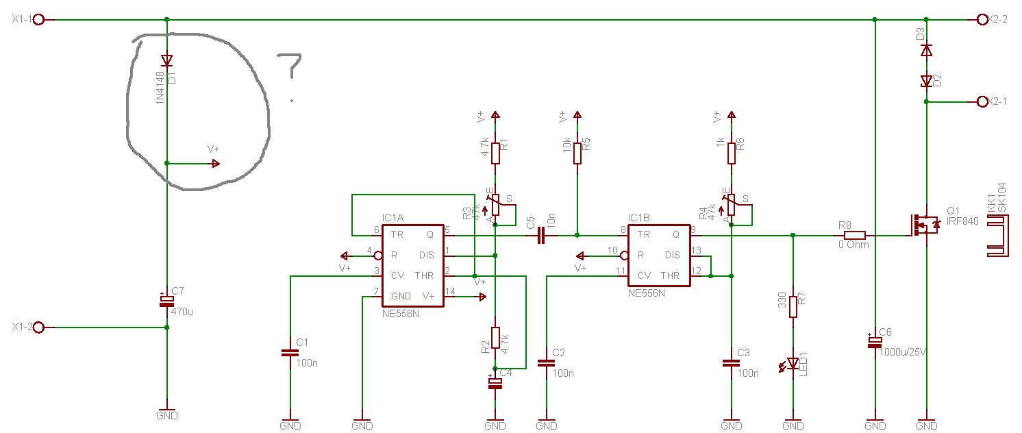 X1:Stromversorgung mit Plus an 1 und Minus an 2, X2:Last. D1/C7 entkoppelt die Stromversorgung der 555er von der störverseuchten Hauptstromversorgung.
