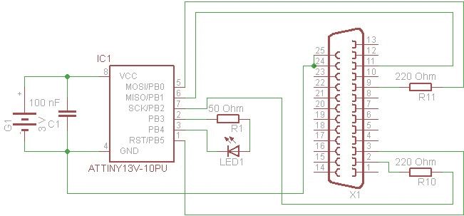 Habe gestern eine neue Bestellung zusammengestellt (Reichelt), u.a. auch ein paar ATmega8 mit dabei und ein Steckboard und ein stab. Netzteil mit 1500mAh und div. Spannungen. @peterfido Ich versuche dann mal so ein Tiny13 wieder zu beleben mit einem ext. Oszilator, schaumama wie wiet ich komme. Ich habe damals nur 2 fuse-bits verstellt: Fusebit DCBA auf "1011:Int. RC Osc. 128 kHz; start-up time: 14 CK + 64 ms\ und Fusebit E auf "1:Divide cock by 8, OFF\ Ich denke das es beim Int.128kHz abgeschmiert ist.Habe seit dem nochmal den fusebit E hin und hergestellt (bei einem neuen tiny13v), ohne Probleme. Bei DCBA traue ich mich nicht mehr :O) @Volkerschulz Sicherlich hast Du mit der STK500 recht, es ist bald Ostern, mein Brief an den Osterhasi ist noch nicht abgeschlossen :O) Ich denke auch das ich da früher oder später nicht herum komme. Meine nächsten "Projekte" sehen nicht spektakulär aus, ich möchte als erstes dann z.B. ein Lauflicht oder Knight-Rider-Licht mit der ATmega8 entwickeln (entwickeln heisst hier selber dahinterkommen, NICHT googeln). Als nächste habe ich noch ein paar Servos aus meiner Modellbaukiste noch rumfliegen, die sollen auch nicht verschont bleiben. Nachdem ich alles ausgiebig studiert habe kommt mein eigentlicher Wunsch: ein kleiner Roboter, der z.B. einen Lichtstrahl und später dann mit einem 2. Roboter per Funk kommuniziert... so... das wars schon... :O) Da ganze getippe hier führte mich zu einer neuen Frage: Kann ich eigentlich die ATmega8 auch über meinen selbstgebastelten Paralleport Stecker programmieren (siehe Bild)? Also so wie die ATtiny13 (MISO,MOSI,SCK,RST und natürlich +5V und GND) ansteuern ?