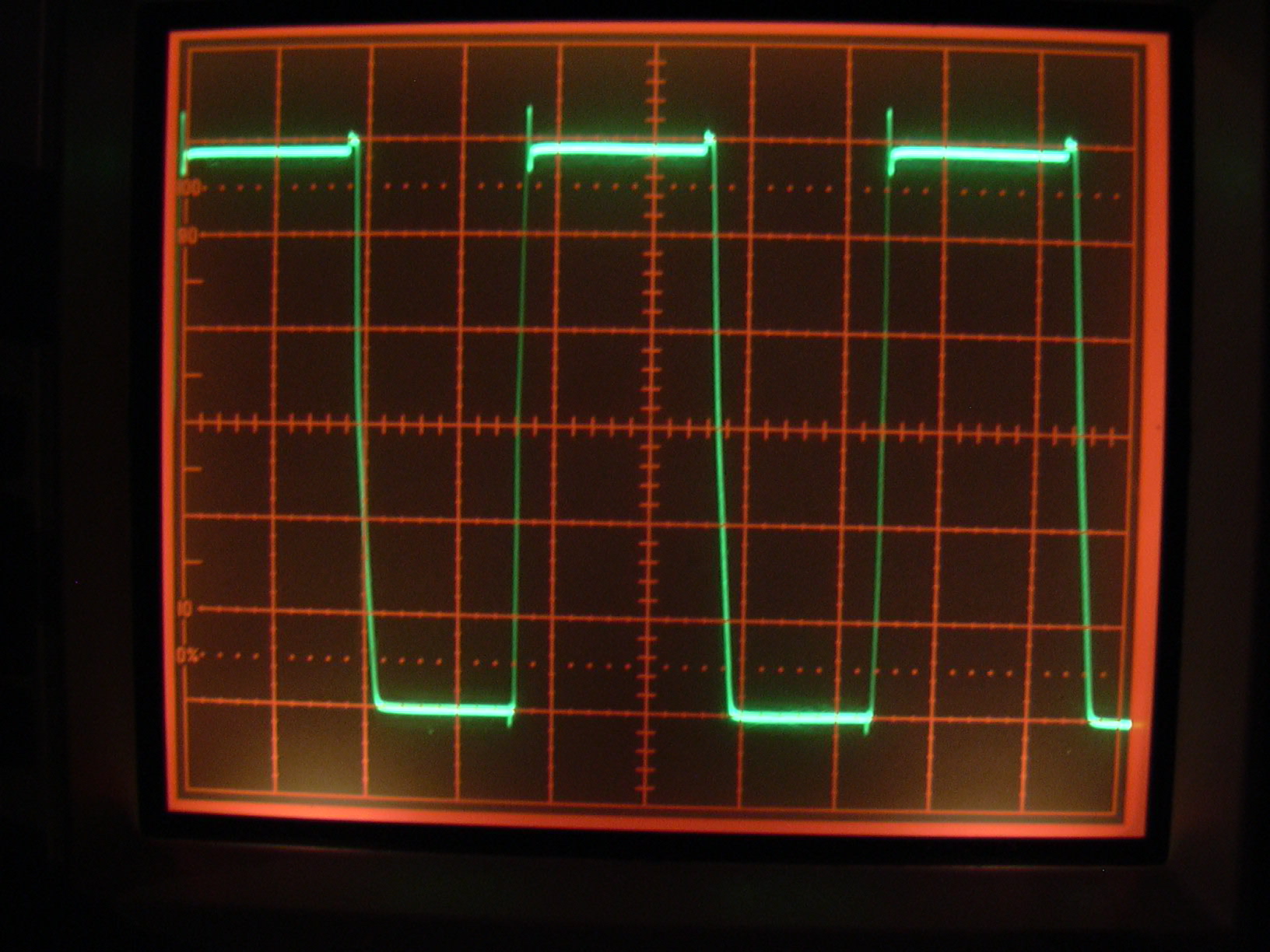 Da ich kein Speicheroszi habe, so einige Messergebnisse jedoch dokumentieren wollte, habe ich etwas mit der Digicam rumgespielt. Hier ein paar Infos, wie man recht gute Ergebnisse hinbekommt: - Blitz ausschalten von der Kamera - Nahbereich wählen - am besten in einem möglichst dunklen Raum sein - ein Schreibtischlampe o.ä. einschalten, die nicht allzuviel Licht bringt, vielleicht so 20-60 Lux - Kamera auf Oszi halten und halb durchdrücken. Die Kamera merkt sich jetzt die Belichtungseinstellung, die durch das zusätzliche Licht auf vielleicht 30-300ms eingestellt ist. - Licht ausschalten, weiterhin halb gedrückt halten. Dabei Entfernung nicht verändern, sonst wird das Bild später unscharf. Dann durchdrücken. - Strahl des Oszis so einstellen, dass er nicht überblendet. Mit der Helligkeit der Lampe kann man etwas experimentieren, so dass man zu guten Belichtungszeiten kommt. Profikameras haben natürlich den Vorteil, dass man dort Belichtungszeit manuell einstellen kann. Sowas gutes habe ich nicht. Anbei ein Foto des Resultats. (5us/0.5V)