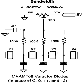 Habe diese Schaltung gefunden. Es ist ein 4 poliges Quarzfilter bei dem man die Bandbreite mit Kapazitätsdioden einstellen kann. Ob mir jemand sagen kann, wie das funktioniert?