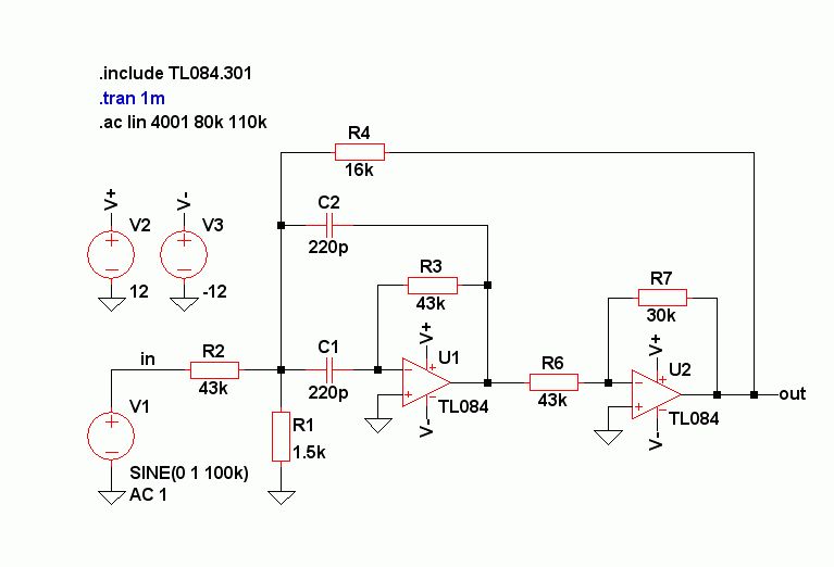 Dass die Mittenfrequenz in der Simulation nur etwa 88kHz beträgt, könnte tatsächlich mit der begrenzten Bandbbreite der OpAmps zu tun haben. Die Verstärkung stimmt trotzdem ganz gut überein. @Helmut S.: Nicht in einer Appnote, sondern auf S. 16 im Datenblatt des TL084: http://focus.ti.com/general/docs/lit/getliterature.tsp?genericPartNumber=tl084&fileType=pdf