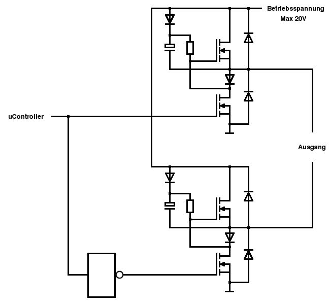 Hier mal eine kleine Anregung. Anmerkungen: 1. Es kann kein Kurzschluss durch fehlerhafte Ansteuerung entstehen. 2. Die unteren FETs werden nicht optimal angesteuert - evtl. also noch eine Treiberstufe erforderlich. Funktioniert aber auch so. 3. Bei einem Tastverhältnis von 50% steht der Motor. 4. Die Schaltung sollte nicht längere Zeit ohne Signal (PWM) sein, da irgendwann die Ladung im Bootstrap-Kondensator nachlässt und der obere Transistor hochohmig und somit heiß wird. T: z.B. IRF720 D: z.B. 1N4007 C: z.B. 22uF 25V R: ca. 1k Die Betriebsspannung sollte die maximal zulässige Gate-Source-Spannung nicht überschreiten. Gruß Jobst