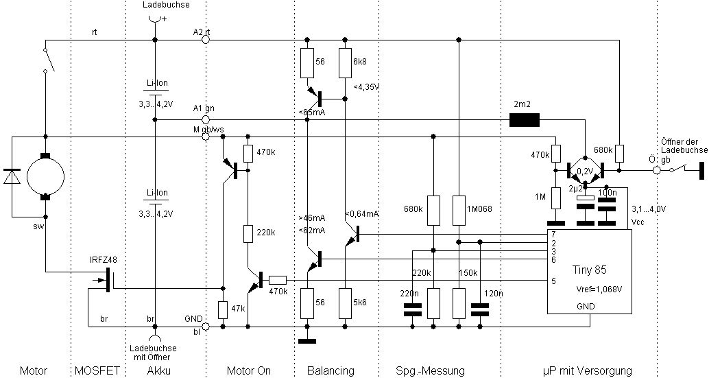 Nach viel Ärger mit NiMh-Akkus und reichlich Vorräten von intakten Li-Ion-Zellen aus Laptops und Schraubern, habe ich einige Geräte mit Li-Ion-Zellen ausgerüstet. Im Anhang der Schaltplan für einen Akku-Sauger mit 2 Zellen. Ich habe noch keine Langzeit-Erfahrung, mich interessiert aber eure fachkundige Meinung und evtl. Verbesserungsvorschläge. Ziel war geringer Aufwand aber mit Balancing. Ich wollte alles mit einem ATtiny85 machen. Die Invertierung für den MOS war nötig, damit er nicht sofort losrennt und ich eine Ruhe-Spg-Messung machen kann. Sie dient zur Erkennung, ob Motorbetrieb oder Ladebetrieb vorliegt. Entsprechend macht er Balancing oder Unter-Spg-Erkennung. Das Einschalten geschieht über die Motor-Spg oder über den Öffner der Ladebuchse. Die bisherige Erfahrung: alles läuft bestens - saugt wie Hulle, kriegt auch 2V mehr als mit den NiCd. Der Spg-Einbruch beim Einschalten ist erheblich, deshalb beginnt die Unter-Spg-Erkennung erst nach ein paar ms. Im Betrieb zieht der Motor ca. 11A, die Spannung bricht dabei um ca. 0,6V pro Zelle ein (vlt. sind die Zellen doch nicht mehr so gut). Den Balancing-Strom habe ich mal auf 50mA eingestellt - ich weiß nicht, ob das normal ist. Die Spg-Messung hat nur eine Auflösung von 8mV. Ich lade mit einem Labor-Netzteil und gehe vorsichtshalber nur auf 4,1V/Zelle. Bei Unter-Spg-Erkennung schaltet der Motor für 5sec aus. Die Schaltung ist für beliebige Zellenanzahl geeignet, allerdings ist die Spg-Messung dann zu ungenau - ich denke da über eine Potentialverschiebung mit LM285 nach, da ja nur >3V gemesen werden muss. Die Schaltung braucht etwas Ruhestrom. 25µA ergibt 18mAh/Monat. Dies soll eine Anregung sein, habe bisher noch keine Vorschläge gesehen, die mit einem Billig-AVR auskommen. Gibt es Verbesserungsvorschläge?