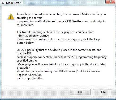 es spinnt nur wenn ich die datenleitungen dran hab, die isp frequenz liegt im kHz bereich... im controller hab ich die pins alle auf ausgang gestellt und auf masse gelegt