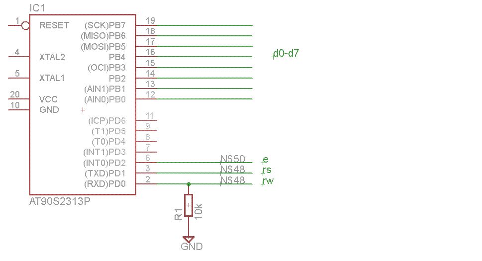 ich hab die Anschlüsse D0-D7,E,RS,RW einfach an die pins des µC geführt.