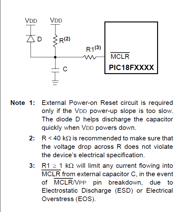 Für R<40kOhm ladet sich der Kondensator schnell genug auf um die elektrischen Spezifikationen des Mikrocontrollers beizubehalten